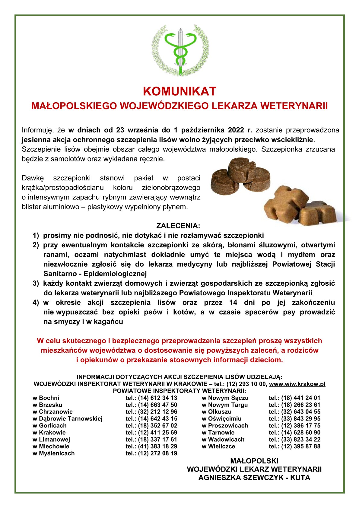 Od 23 września do 1 października 2022 r. zostanie przeprowadzona jesienna akcja ochronnego szczepienia lisów wolno żyjących przeciwko wściekliźnie. Szczepienie lisów obejmie obszar całego województwa małopolskiego.