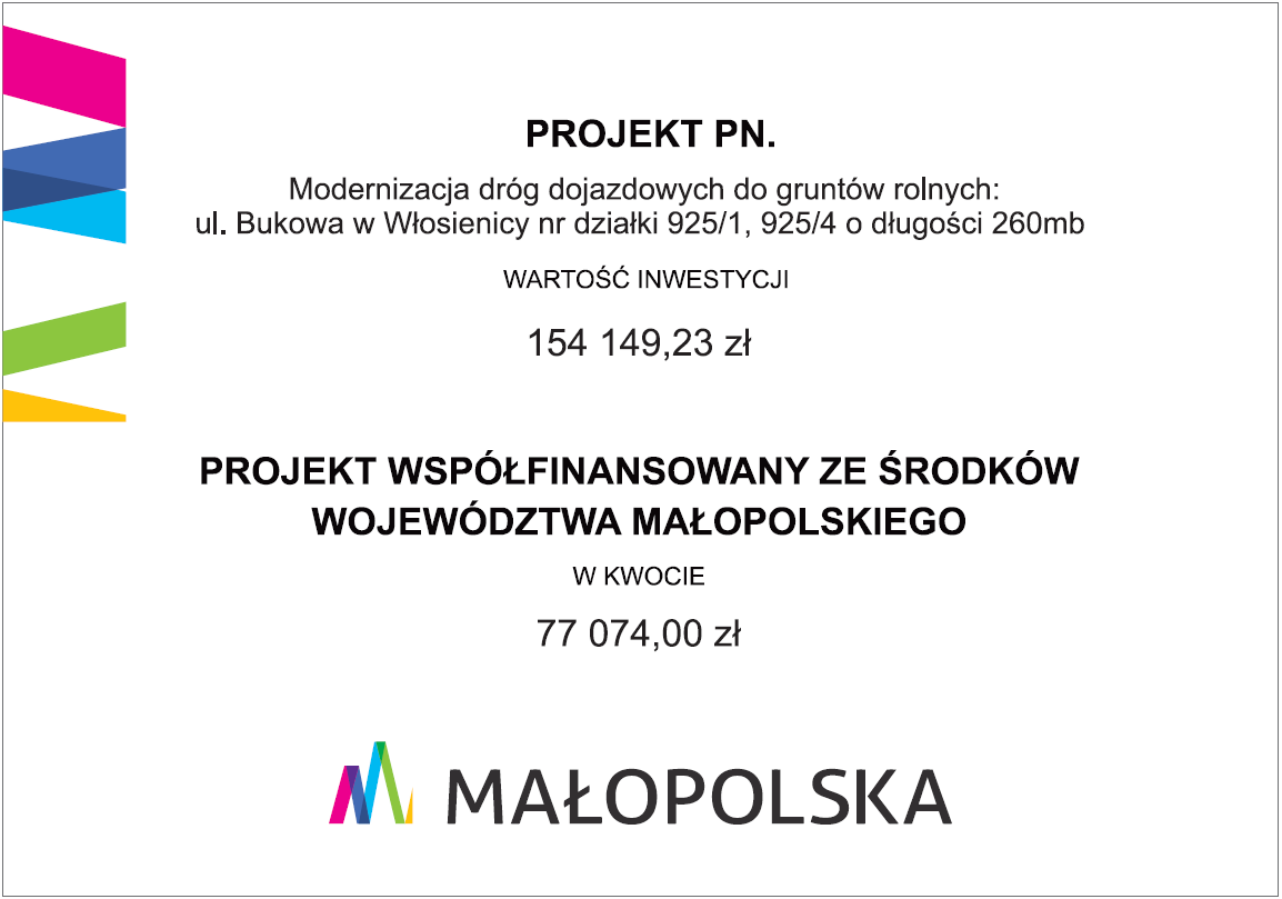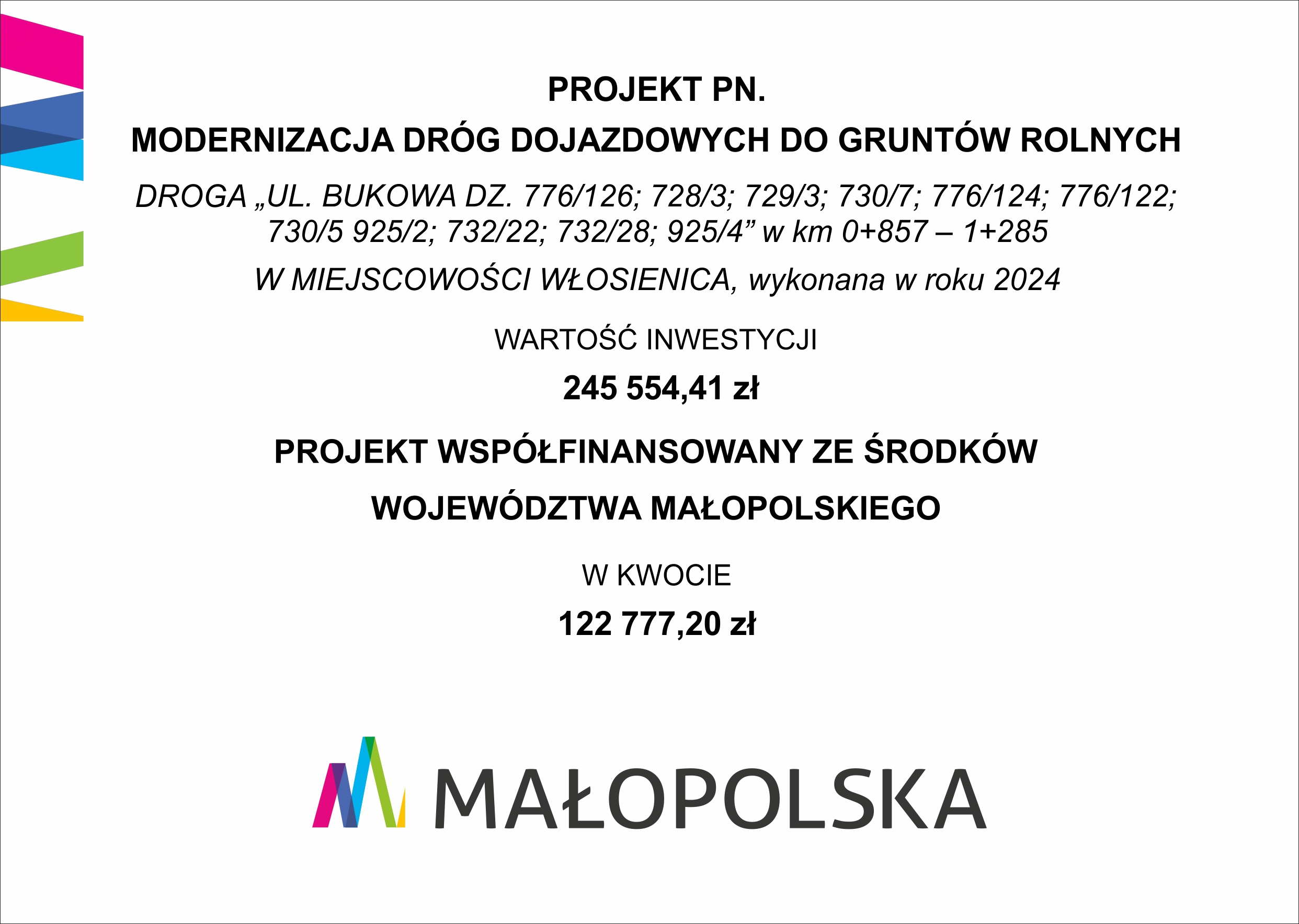 W 2024 r. również z udziałem środków budżetu województwa małopolskiego związanych z wyłączeniem z produkcji gruntów rolnych zrealizowaliśmy remont kolejnego odcinka ul. Bukowej we Włosienicy w km od 0+857 do 1+285 (dz. nr 776/126; 728/3; 729/3; 730/7; 776/124; 776/122; 730/5; 925/2; 732/22; 732/28; 925/4). Wartość inwestycji wyniosła 245 554,41 zł z czego 122 777,20 zł stanowił wkład województwa małopolskiego.