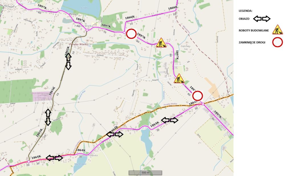 Od 21 lipca zamknięta będzie ul. Wadowicka w Porębie Wielkiej na odcinku od skrzyżowania z ul. Grottgerówką (DP 1866K) do skrzyżowania z ul. Stawową w Polance Wielkiej (DP 1864K).