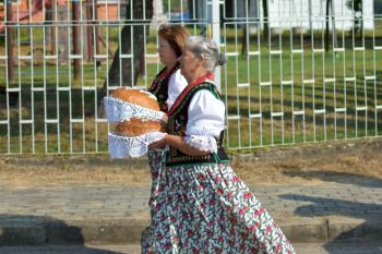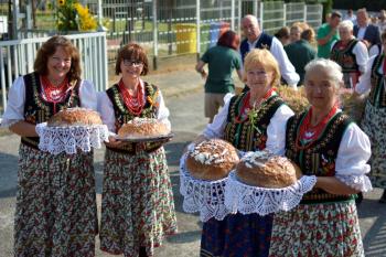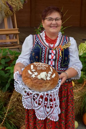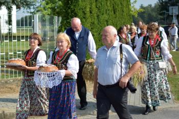 Kolejnym, ważnym, a może najważniejszym elementem uroczystości była ceremonia wręczenia wieńca i chleba dożynkowego. Głównymi aktorami byli gospodarze tegorocznego Święta Plonów - Marzena i Michał Jarnotowie. Tradycja nakazała, aby przekazanie chleba nastąpiło przy śpiewie – w tym przypadku zespołu Porębianie.