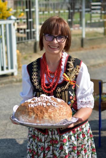 Marzena i Michał Jarnotowie byli tegorocznymi gospodarzami dożynek. W Porębie Wielkiej mieszkają od 8 lat, a przenieśli się z Zatora i Przeciszowa. Są rodzicami trzech córeczek. Pani Marzena jest jeszcze na etacie mamy w domu, ale planuje założyć biznes – działalność artystyczną, florystyczną dla lokalnej społeczności. Z kolei pan Michał prowadzi od 13 lat własną firmę, zajmującą się transportem i spedycją.