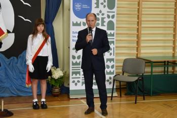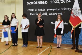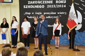 Dyrektor Marek Skrzypecki przywitał uczestników uroczystości i zauważył, że jest ona okazją do pożegnania, podsumowania i złożenia gratulacji. Podkreślił dobre wyniki uczniów i podziękował rodzicom, nauczycielom oraz pracownikom administracji i obsługi.