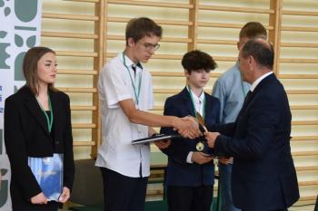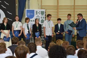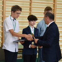 Wójt Mirosław Smolarek dołączył do podziękowań i gratulacji. Jak stwierdził, statuetka za najwyższą średnią ocen dla Adama Słowika świadczy o wysokim poziomie nauczania w szkole, która zasłużenie cieszy się dobrą renomą na ziemi oświęcimskiej.
