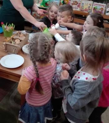 Spotkanie zakończyliśmy wesołą zabawą „Jajka do gniazdka” do piosenki „Gdacze kura: ko ko ko” i degustacją czekoladowych jajek.