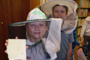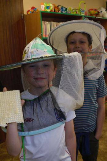 Uczniowie mieli możliwość zobaczyć pszczelarza w tradycyjnym stroju. Sami także mogli ubrać ochronny kapelusz na głowę.