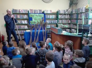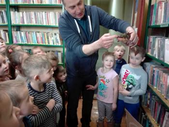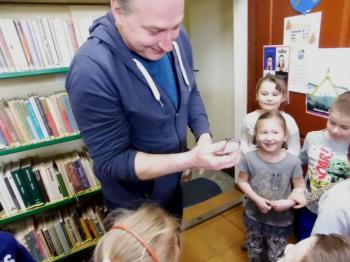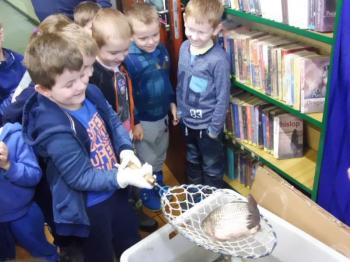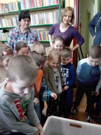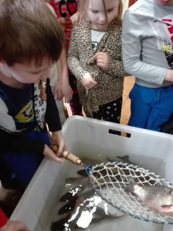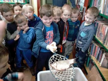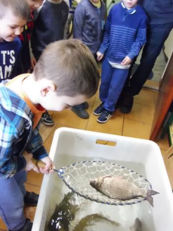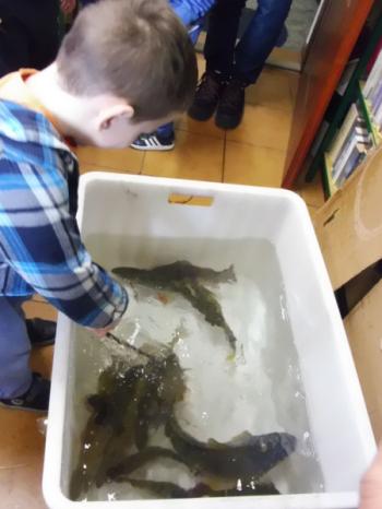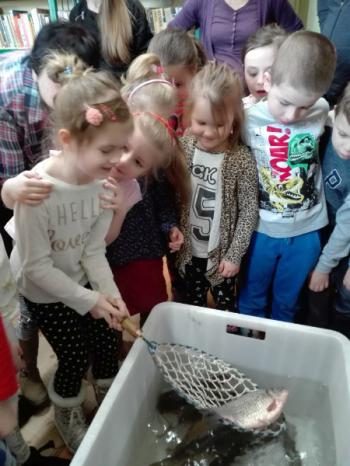 Ryby, które już obudziły się z zimowego letargu i zostały przetransportowane w specjalnym zbiorniku do biblioteki, wzbudziły dużo emocji i radości. Wśród nich wyróżniał się dorodny karp, drapieżny szczupak, zwinny okoń i całkowicie pokryty łuską leszcz. Każdy uczestnik mógł osobiście wyłowić rybę kasarkiem. Dzieci odgadywały jaką rybę udało się im złowić. Pomiędzy pływającymi rybami wypatrzyliśmy złotą rybkę, którą wszyscy jednogłośnie zdecydowali wypuścić do pobliskiej rzeki „Macochy”. Oczywiście każdy głośno mógł wypowiedzieć swoje marzenie. „Złota rybka” z pomocą Pana Witka szybko zniknęła w nurtach rzeki zabierając ze sobą wszystkie życzenia.
