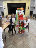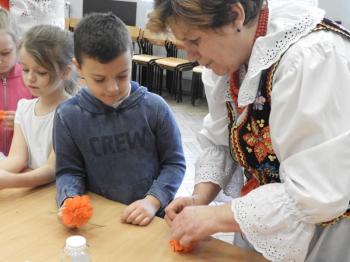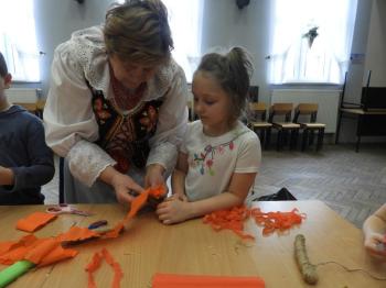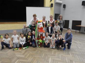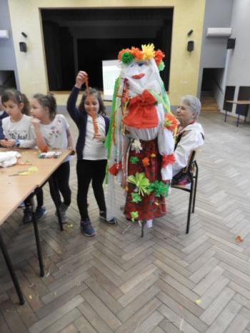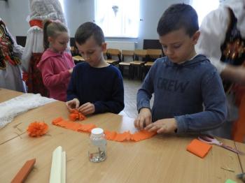 Po krótkim wprowadzeniu w temat wiosennych zwyczajów i obrzędów, Panie przystąpiły do wykonywania Marzanny. Jak na „koleżankę” Pań z Koła Gospodyń przystało, musiała mieć tradycyjną spódnicę ludową oraz białą bluzkę. Twarz malowały same dzieci, a wianek i pozostałe dekoracje powstały z bibułowych kwiatów i wstążek. Efekt był zachwycający.