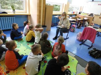 z książką. Pełne ręce roboty i to dosłownie przyniosła literka ń. Uważne wsłuchiwanie gdzie się ukryła bohaterka wiersza „Ni to ni owo”, niespodziewanie przyniosło jeszcze jednogłośną obietnicę, że pchły nigdy nie głaskałabym. Uroczy ślimak w każdej zwrotce płatał figle i palce dzieci też psociły udając czułki mięczaka. A ślimak, jak to ślimak „...mknąc jak strzała, przedwczorajszy ścigał świt!...”. Tak wspaniale bawiły słowem dwie znakomite mistrzynie pióra, Małgorzata Swędrowska i Agnieszka Frączyk w „Elementarzu w podskokach”.