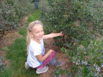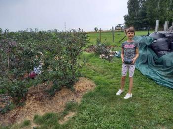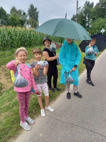 Była też piesza wyprawa na plantację borówki Państwa Gasidło: tam każde dziecko otrzymało swój pojemniczek, do którego mogło nazbierać sobie owoców. Dzieci mogły też zapoznać się z pracą na plantacji.