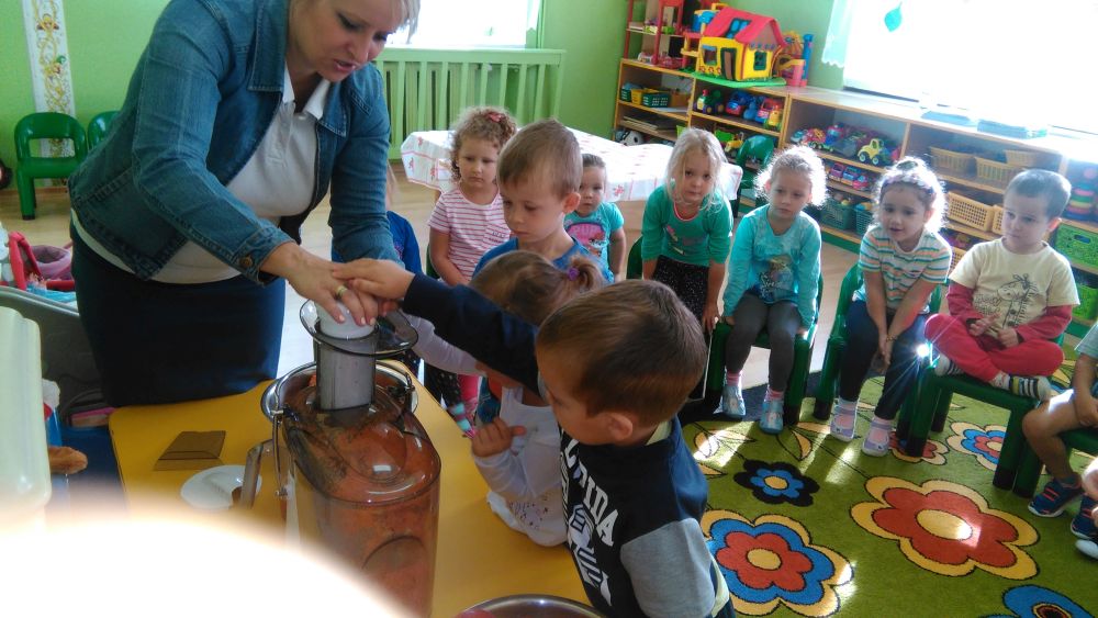 Po wycieczce do sadu Pani Drzewieckiej i przyniesieniu do przedszkola pysznych owoców zebranych w sadzie, wspólnie z naszą panią zrobiliśmy pyszne soki z wykorzystaniem sokowirówki oraz takich owoców jak: jabłuszka, gruszki i maliny oraz soczyste i chrupiące marchewki. Mniam …… samo zdrowie.