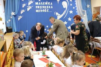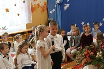 To grudniowe przedpołudnie było pełne ciepłych świątecznych życzeń od naszych gości, wspólnie śpiewanych kolęd oraz pięknych prezentów pod choinką. W świąteczny nastrój wprowadziły nas również przedszkolaki z grupy „Kotki” recytując wiersze o tematyce świątecznej.