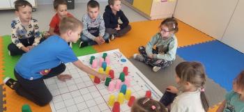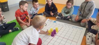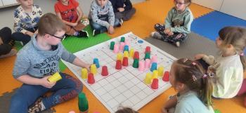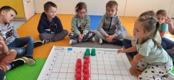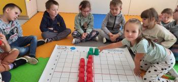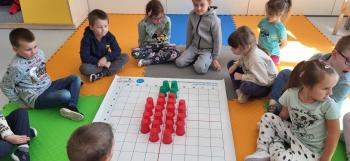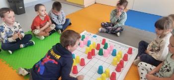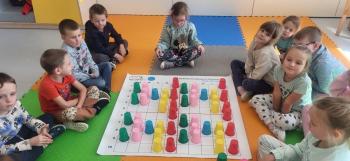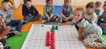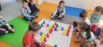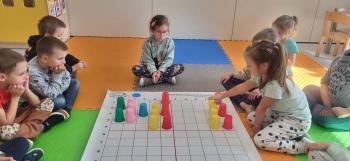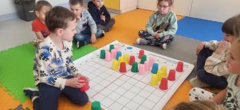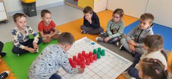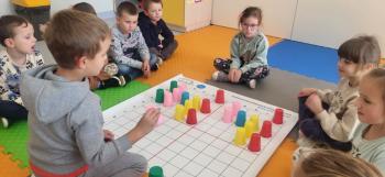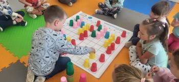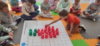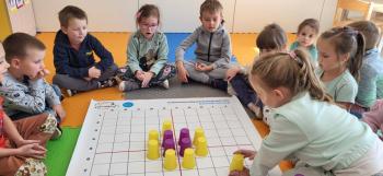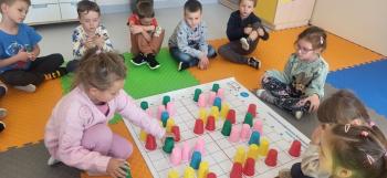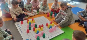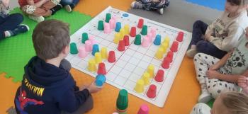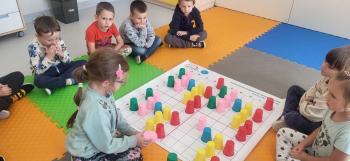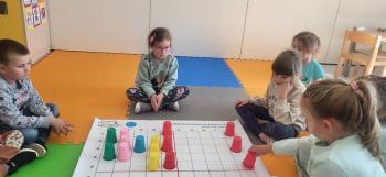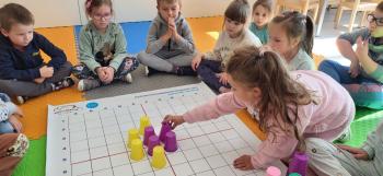 Podczas zajęć z wykorzystaniem maty do kodowania i kolorowych kubeczków, Kotki wzięły udział w zabawach: "Ułoż, tak jak ja", której celem było odwzorowanie takiego samego ukladu kubeczków na innych płaszczyznah maty oraz "Zabawa z symetrią", w której przedszkolaki uzupełniały pola po przeciwnych stronach maty.