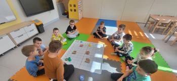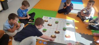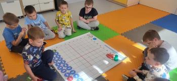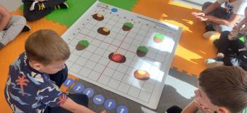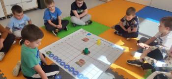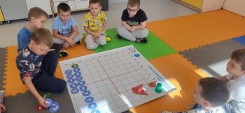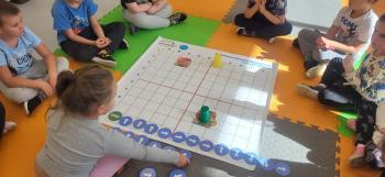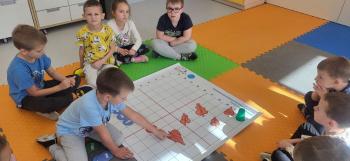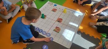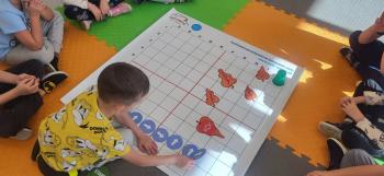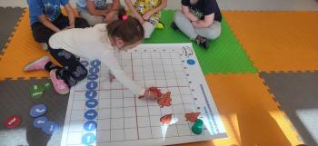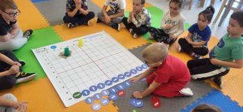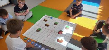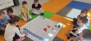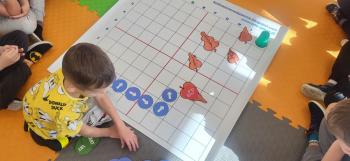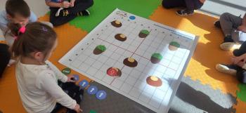 "Zbieramy dary jesieni" to kolejna propozycja zabawy z wykorzystaniem maty do kodowania, symboli darów jesieni oraz strzałek kierunkowych w grupie Kotki. Dzieci w dalszym ciągu uczyły się ukladać skrypt do postawionego warunku w zadaniu do wykonania. Zebrane dary jesieni podczas zabawy sprawiły dzieciom wiele radości.