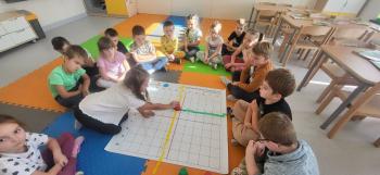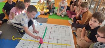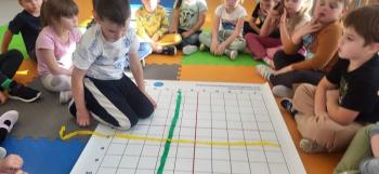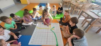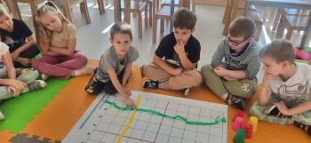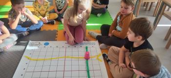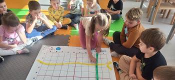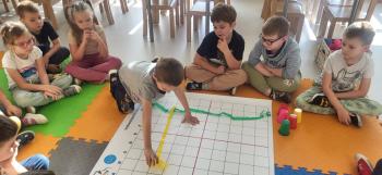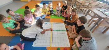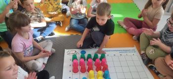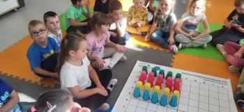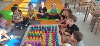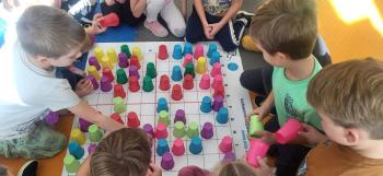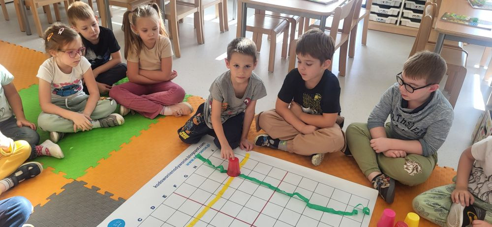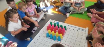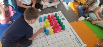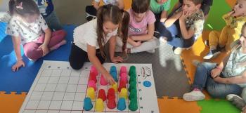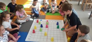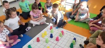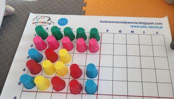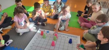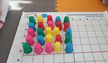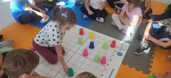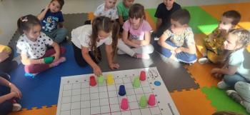 Podczas kolejnej zabawy z kubeczkami i matą do kodowania Kotki uczyły się, jak ustalać współrzędne punktów na macie do kodowania; układały kubeczki według polecenia. Wiele radości sprawiła dzieciom zabawa z kubeczkami "Kolorowy misz- masz", której celem było zrobienie porządku na macie do kodowania.