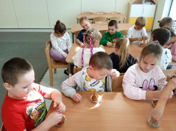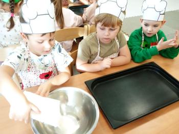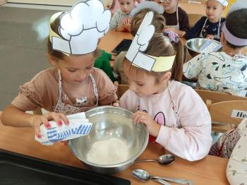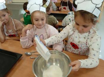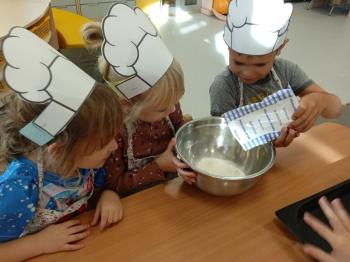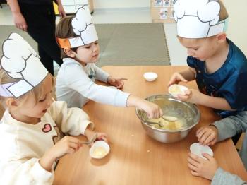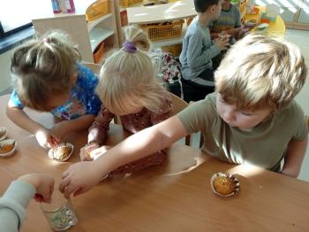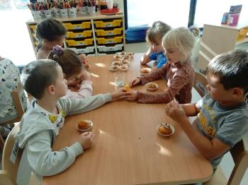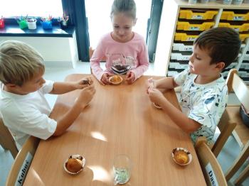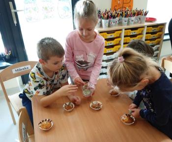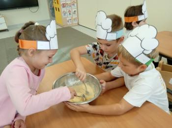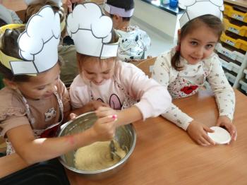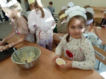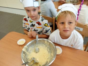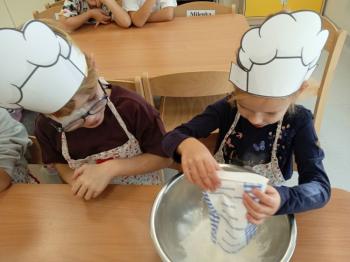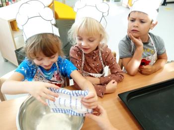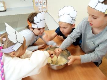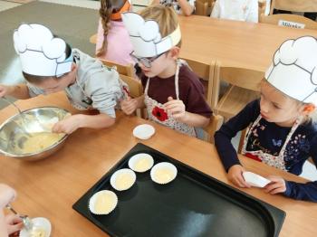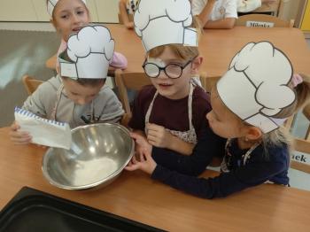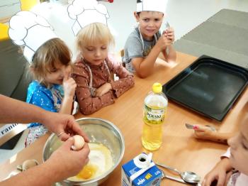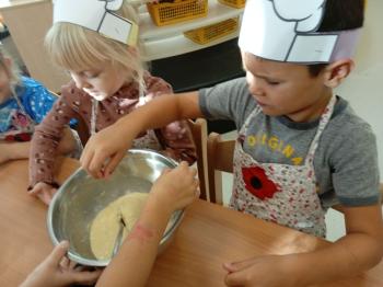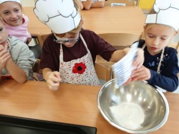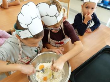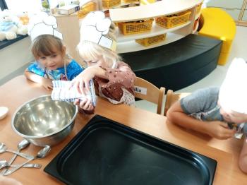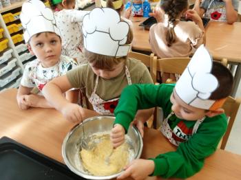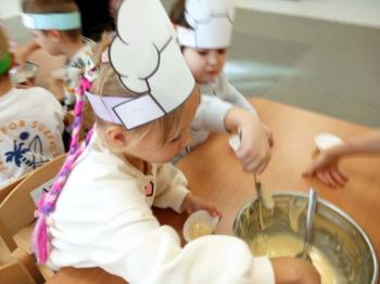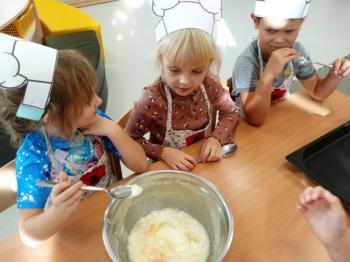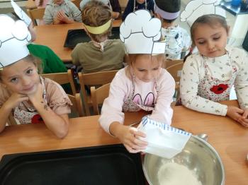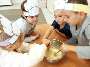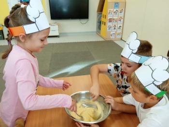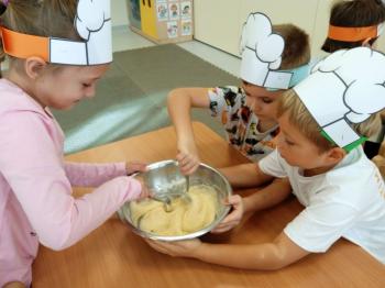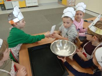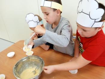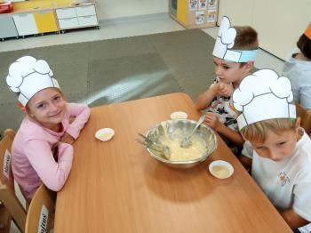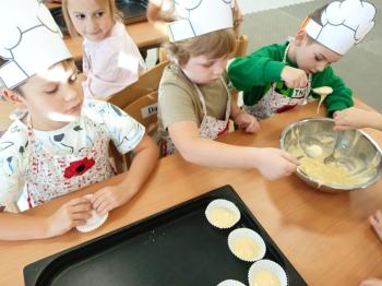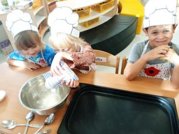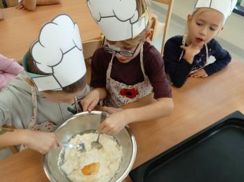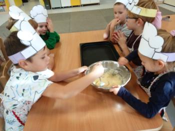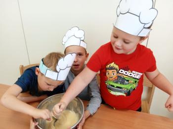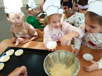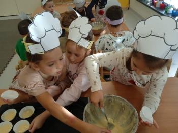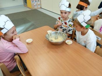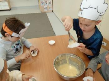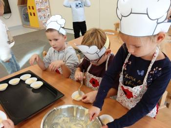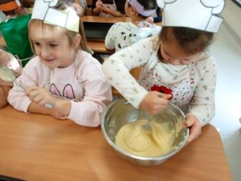 Podczas zajęć kulinarnych dzieci piekły babeczki. Z wielkim zaangażowaniem wykonywały kolejne polecenia, mieszały składniki, odliczały odpowiednie porcje składników, a po upieczeniu dekorowały swoje babeczki. Wszyscy z apetytem zjedli własnoręcznie wykonane smakołyki.