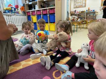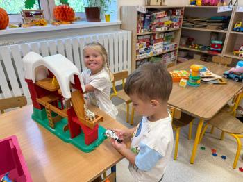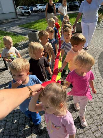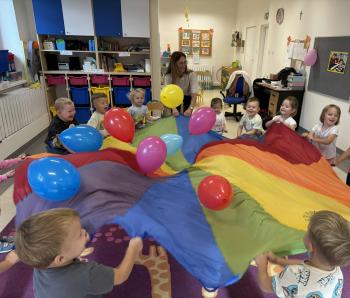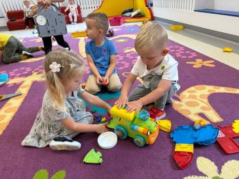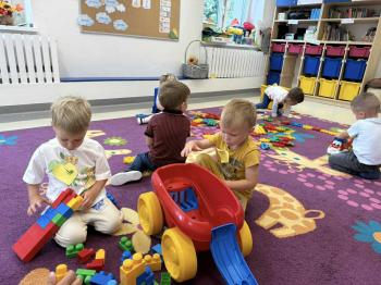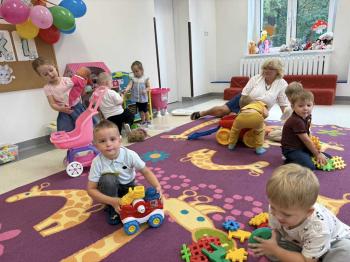 Dzieci poznały swoje panie, nowe koleżanki i kolegów, a także zasady obowiązujące w sali. Było budowanie z klocków, pierwsze wspólne tańce, zabawy ruchowe i oczywiście odkrywanie przedszkolnych zabawek. 🚂🪁