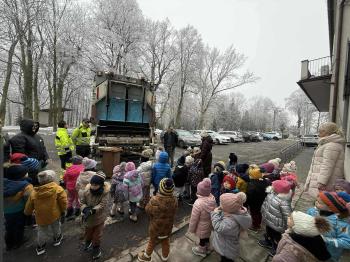 W dniu 1 grudnia w naszym przedszkolu zostały zrealizowane zajęcia, z zakresu poprawnej segregacji w formie prelekcji, prowadzonej przez pracownika Zakładu Usług Komunalnych Sp. z o.o. w Oświęcimiu. Po zakończeniu części teoretycznej, dalsza część prelekcji odbywała się na zewnątrz, a dzieci miały okazje z bliska zobaczyć i zapoznać się z działaniem śmieciarki. Chętni mieli szanse usiąść za kierownicą tego pojazdu.