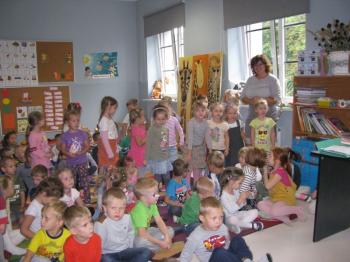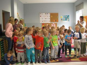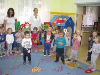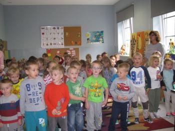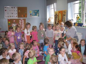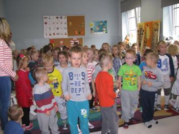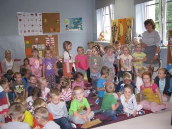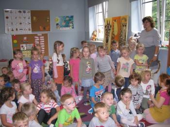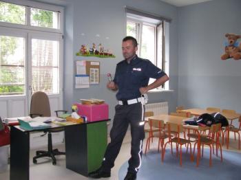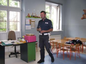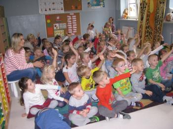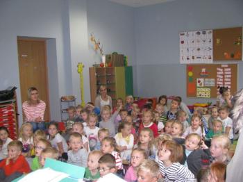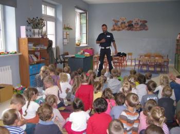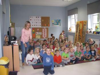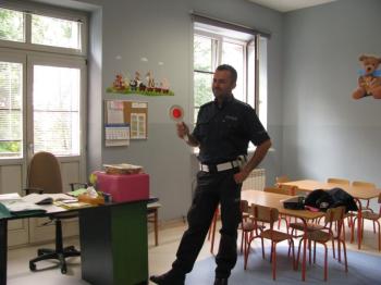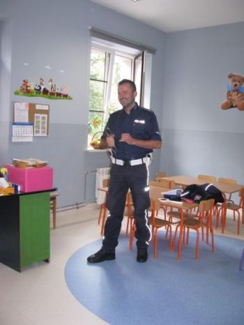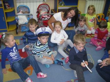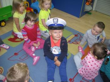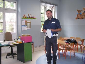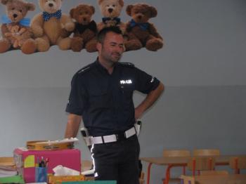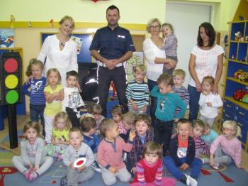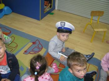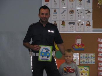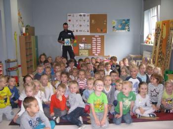 Dnia 29.09.2015r. do naszego przedszkola przybył Pan Policjant z Komendy Powiatowej w Oświęcimiu.Podczas spotkania dzieci dowiedziały się o tym, jak bezpiecznie poruszać się po drogach, podróżować samochodem, bawić się bezpiecznie w domu i w przedszkolu, oraz jak reagować w sytuacji innych zagrożeń. Duże zainteresowanie u dzieci wywołało umundurowanie i wyposażenie policjanta. W szczególności czapka, lizak, kajdanki oraz wóz policyjny.