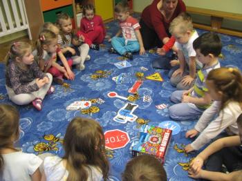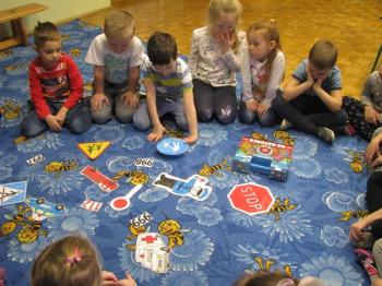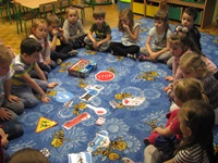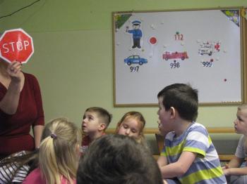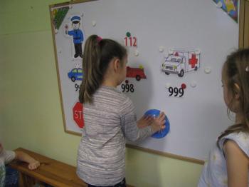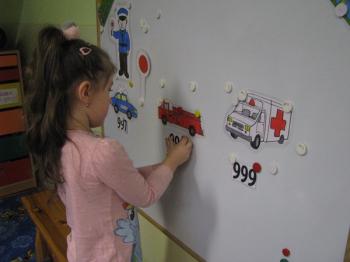 Tym razem podejmowaliśmy tematykę związaną z sytuacją, gdy zdarzył się wypadek. Dzieci przypomniały sobie numery telefonów alarmowych, utrwaliły nazwy samochodów specjalistycznych i określiły, jaką pomoc mogą nieść w nagłych wypadkach.