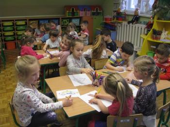 Przedszkolaki kolorowały i wycinały wybrany przez siebie samochód. Dużym zainteresowaniem cieszył się samochód policyjny i ambulans.