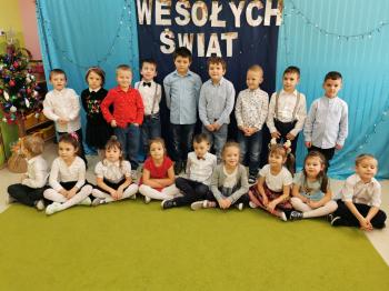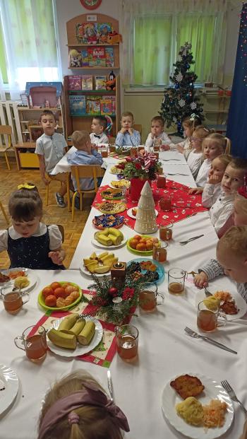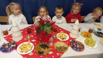 W dzień przedszkolnej Wigilii w całym przedszkolu panowała radosna, ożywiona atmosfera. Świąteczne dekoracje oraz dzieci w galowych strojach wprowadzały nastrój oczekiwania na wyjątkowe, niecodzienne wydarzenie. Na przedszkolnych stołach zagościły tradycyjne potrawy: barszcz z uszkami oraz ryba i wiele łakoci w postaci pierniczków czy przeróżnych smakowitych bakalii. Po wspólnym posiłku śpiewaliśmy piekne kolędy i pastorałki, które umilały nam ten piękny czas.