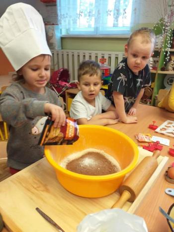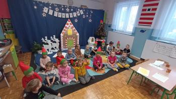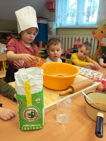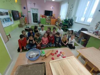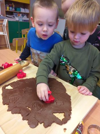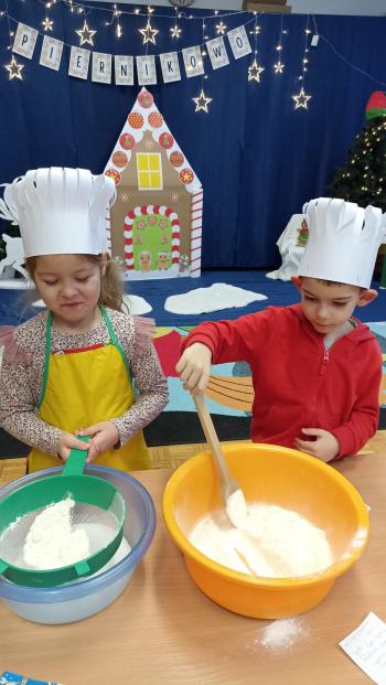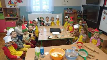 Nasze przedszkolaki przeniosły się do bajecznej krainy zwanej "Piernikowo", w której wyrabiały, zagniatały i wykrawały wszystkie możliwe kształty pierniczków. Pieczenie pierniczków w naszym przeszkolu stało się już coroczną tradycją