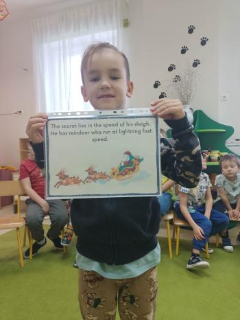 W grudniu w ramach Ogólnopolskiego Programu Edukacyjnego English Special Days dzieci obchodziły „Santa Claus Day”. Na początku Tropiciele układali z rozsypanki literowej napis „SANTA”. Następnie wspólnie zaśpiewaliśmy piosenkę „S.A.N.T.A”. Dzieci nazywały elementy stroju Mikołaja – oczywiście w języku angielskim.  Przedszkolaki z zainteresowaniem słuchały historyjki jak Święty Mikołaj dostarcza prezenty. Zabawa „Co ma w worku Mikołaj?” najbardziej spodobała się dzieciom. Tropiciele odgadywali jaki prezent kryje się w worku Mikołaja, a następnie nazywali przedmioty po angielsku. Na koniec wspólnie zaśpiewaliśmy i zatańczyliśmy do piosenki „Santa Shark”.