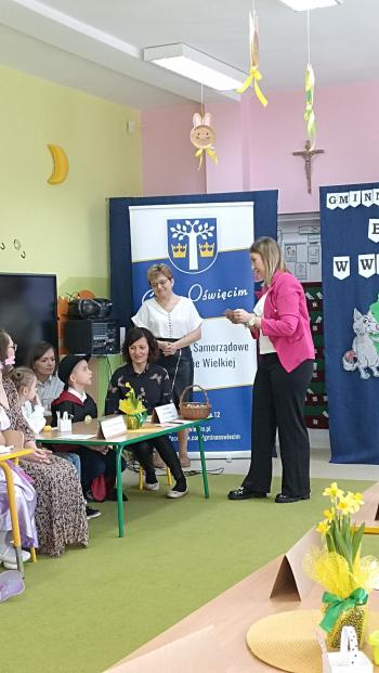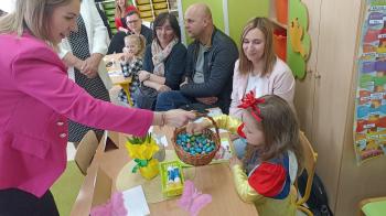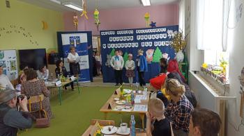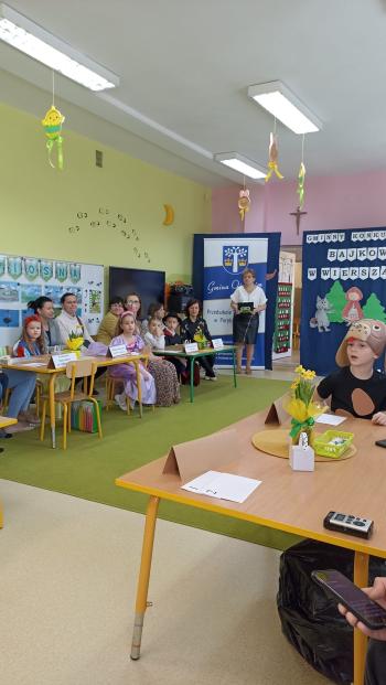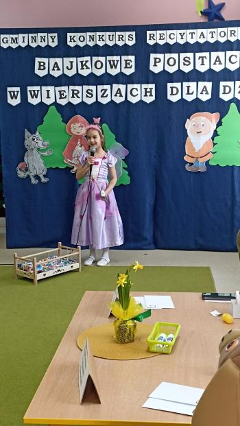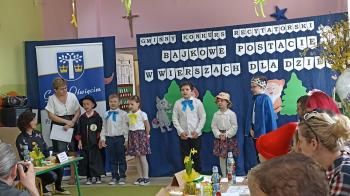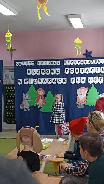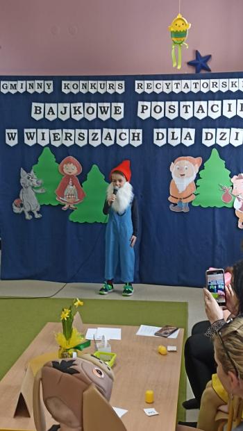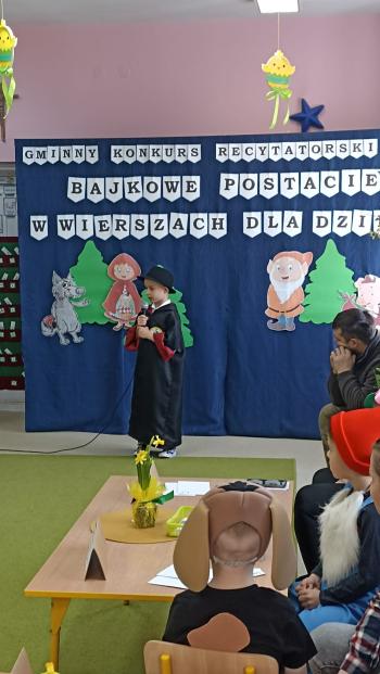 Dnia 31marca odbył się konkurs recytatorski pt. „Bajkowe postacie w wierszach dla dzieci”. Głównym celem konkursu była popularyzacja literatury dziecięcej o tematyce bajkowej, rozwijanie predyspozycji i talentu recytatorskiego dzieci w wieku przedszkolnym . Nasze przedszkole reprezntował Konrad Ż. z grupy Tropiciele w wierszu pt. "Kochamy bajki". Dzieci wspaniale zaprezentowały wiersze przedstawiające postacie bajkowe. Pomiędzy występami były zorganizowane dla dzieci zadania o tematyce bajkowej. Każdy uczestnik za dobrze wykonane zadanie mógł zdobyć czekoladowe jajeczko. Zmagania uczestników oceniało jury. W przerwie zaplanowanej na obrady jury, dzieci z grupy Tropicieli zaprezentowały krótkie bajkowe przedstawienie. Na zakończenie konkursu odbyło się uroczyste wręczenie nagród i dyplomów dla wszystkich uczestników konkursu. Wszystkie dzieci zajęły pierwsze miejsce. Wielkie brawa dla wszystkich uczestników.