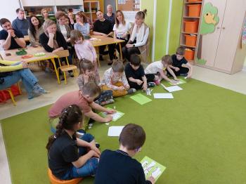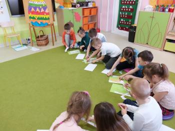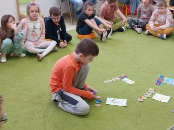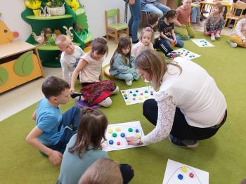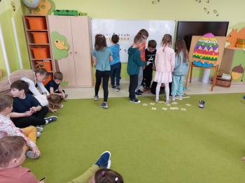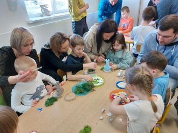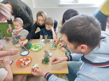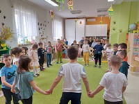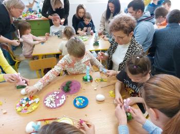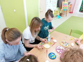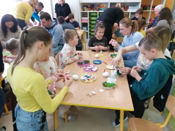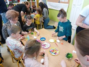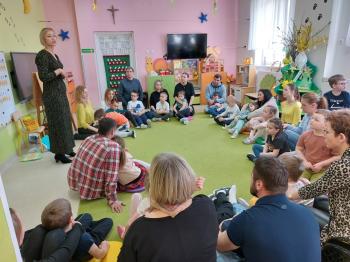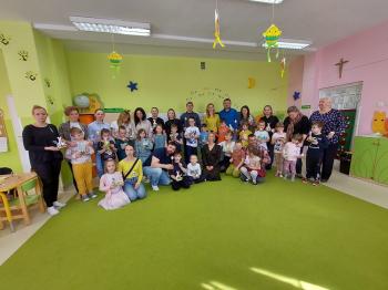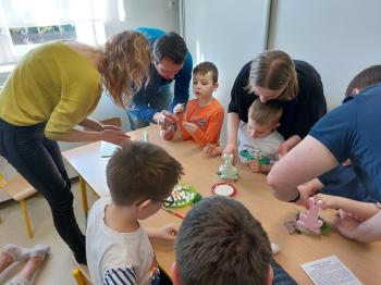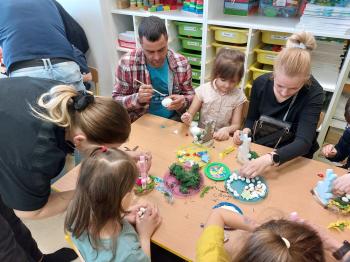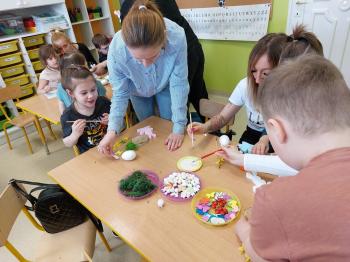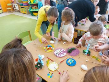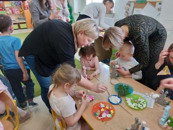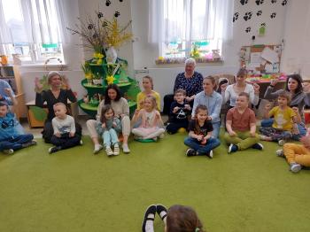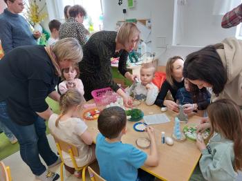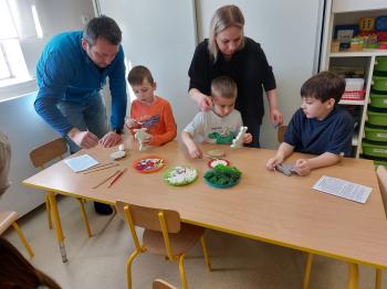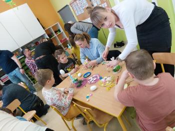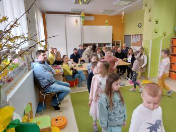 Przedszkolaki z grupy Tropicieli gościły w przedszkolu swoich rodziców, którzy wzięli udział w zajęciach otwartych. Tematyka zajęć dotyczących zbliżających się Świąt Wielkanocnych. Rodzice mieli okazję zaobserwować jak pracują ich pociechy. Na zakończeie zajęć wspólnie z dziećmi wykonali świąteczny stroik.