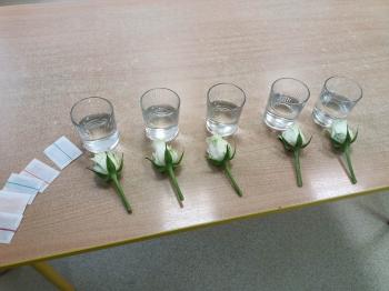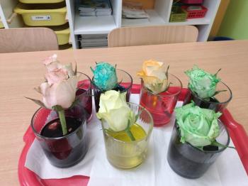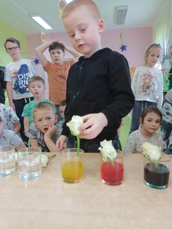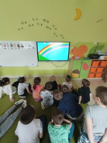 Podczas Dnia Tęczy przedszkolaki utrwalały i nazywały kolory w języku angielskim, śpiewały piosenkę „Rainbow in the sky”. Dzieci miały okazję wykorzystać ekran multimedialny i narysować na nim tęczę. Tropiciele musieli również odszukać i połączyć tęczowe obrazki. Wiele radości sprawił dzieciom tęczowy eksperyment – barwienie kwiatów na różne kolory. Wszyscy z niecierpliwością obserwowali czy płatki kwiatów zmienią kolor.