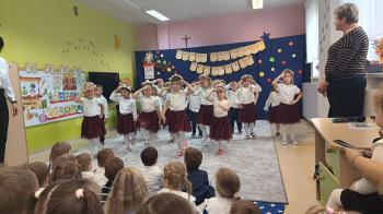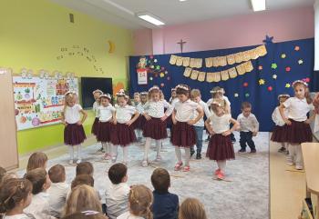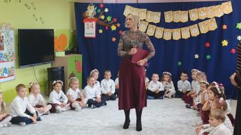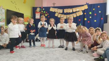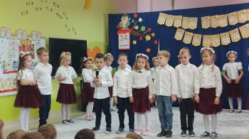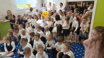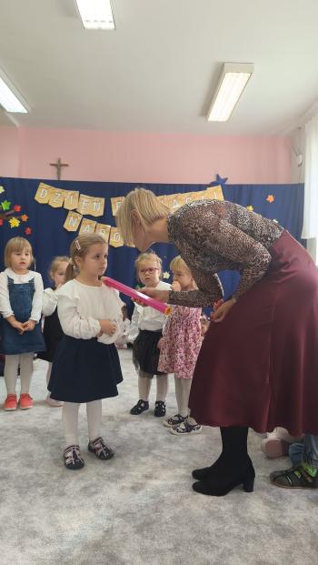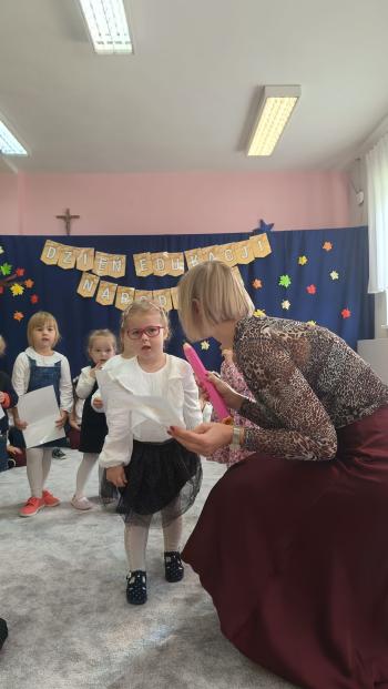 Dnia 14 października świętowaliśmy w naszym przedszkolu Dzien Edukacji Narodowej. Dzieci z najstarszej grupy Tropicieli przygotowały wraz z wychowawcmi krótki montaż słowno - muzyczny. Przedszkolaki podziękowały wszystkim pracownikom przedszkola za opiekę, wsparcie i dobre słowo. Tego dnia świętowały także nasze najmłodsze przedszkolaki z grupy Myszek. Pani dyrektor Renata Krakowczak w tym dniu uroczyście pasowała najmłodzsych na prawdziwych przedszkolaków.