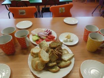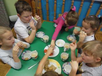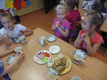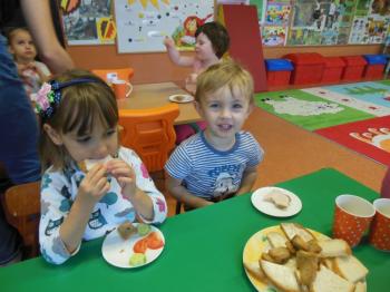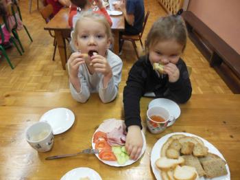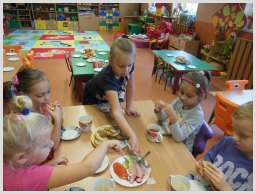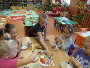 W naszym przedszkolu dbamy o nawyki żywieniowe dzieci w związku z czym w ramach m. in. innowacji „Klub Zdrowego Przedszkolaka” w każdy wtorek i czwartek odbywają się śniadania w formie „szwedzkiego stołu”. Przedszkolaki ze wszystkich grup przedszkolnych samodzielnie wykonują dla siebie śniadanie, mając do wyboru zdrowe i smaczne produkty. Dzieci same decydują o tym jakie produkty znajdą się na ich kanapkach. Przedszkolaki są zachwycone takim śniadaniem, a kanapki sporządzone wg własnego pomysłu bardzo im smakują.