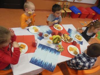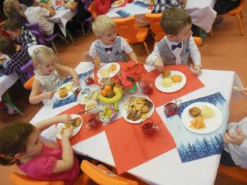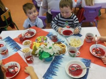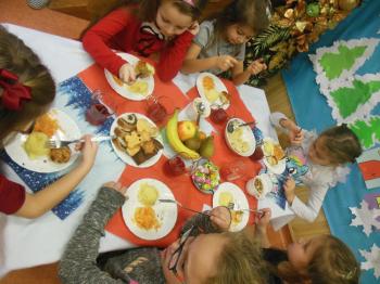 23 grudnia w naszym przedszkolu odbyła się uroczysta wigilia. Po zaprezentowaniu przez „Kaczuszki” okolicznościowego programu artystycznego wszystkie dzieci, nauczyciele i pracownicy przedszkola spotkali się przy świątecznym stole. Było kolędowanie i wigilijny obiad. Biesiadnicy smakowali barszczyk z uszkami, rybkę, orzechy, ciasto, owoce, pierniki i inne smakołyki. Wspólne świętowanie przyczyniło się do kultywowania polskich tradycji i wprowadziło zebranych w radosny nastrój oczekiwania na święta Bożego Narodzenia. Pani dyrektor Barbara Toczek złożyła wszystkim świąteczne życzenia. |