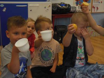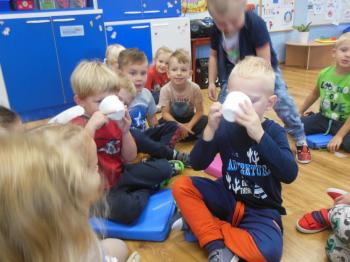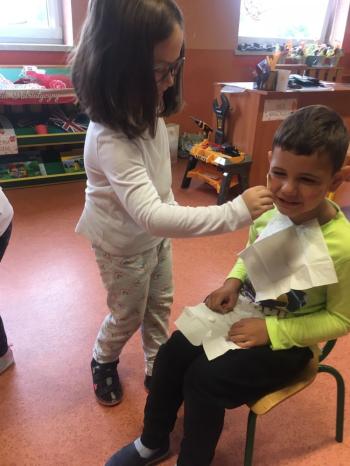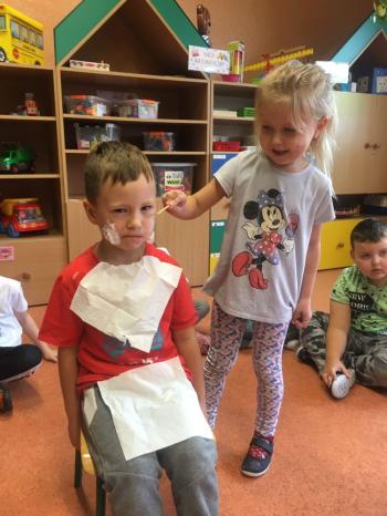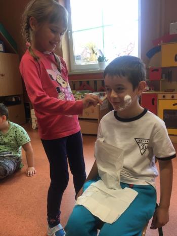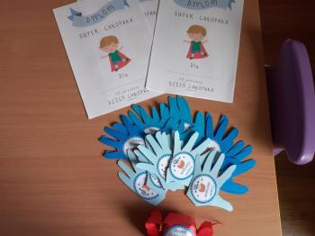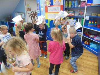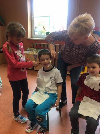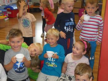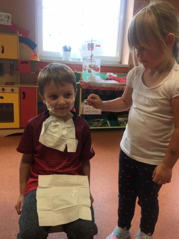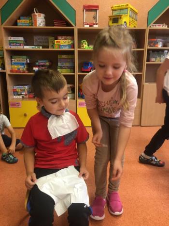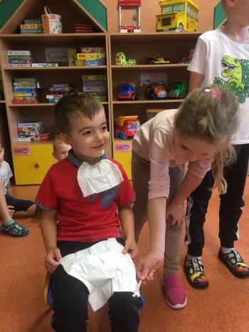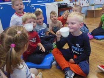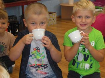 Chłopcy w tym dniu wykazali się wiedzą na temat właściwego zachowania przy stole, odpowiedzieli na wszystkie matematyczne zagadki przygotowane przez swoje Panie, wraz z dziewczynkami bawili się przy muzyce, wykazali się także wielką odwagą wypijając "Eliksir uśmiechu" (sok z cytryny). Celem głównych naszych wspólnych zabaw było sprawdzenie czy nasi chłopcy znają dobre maniery. Przekonanie ich, że właściwe zachowanie nie jest czymś nudnym i nieużytecznym, czymś, co stosuje się tylko by zadowolić mamę czy tatę. Chłopcy wiedzą już, że właściwe zachowanie to wyraz szacunku dla innych i dla siebie samych, dlatego też dołączyli do "Klubu Niezwykle Uprzejmych Chłopaków - Dżentelmenów", co wcale nie było łatwe. Pamiętajcie chłopcy, że nikt dżentelmenem nie może zostać raz na zawsze. Trzeba stawać się nim codziennie. Pamiętajcie też o tym, że tej sztuki trzeba się wytrwale uczyć. |