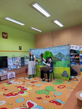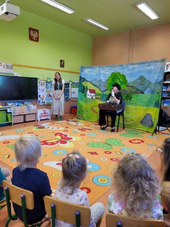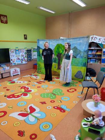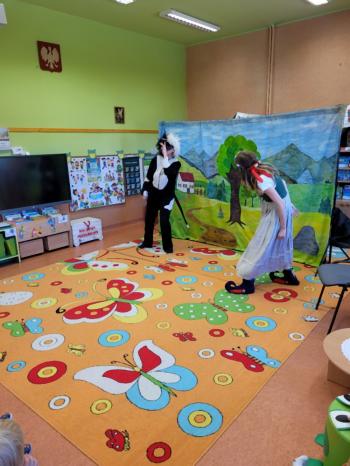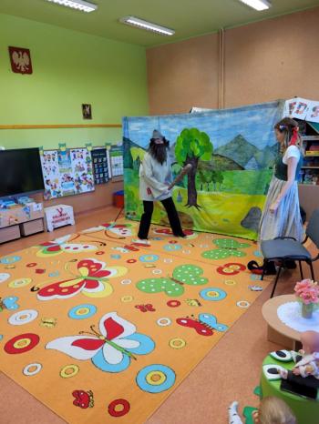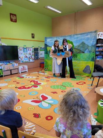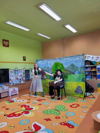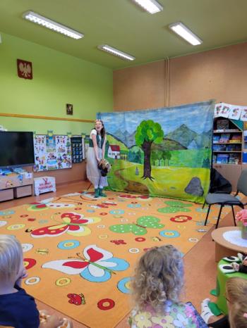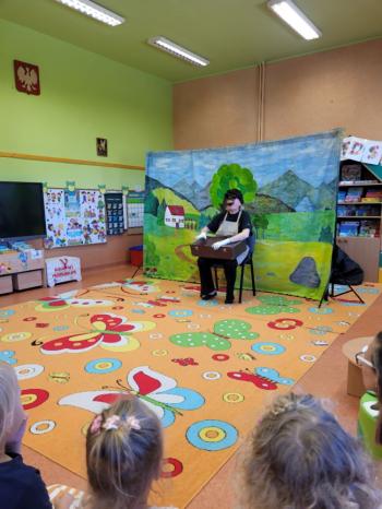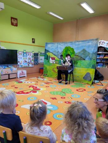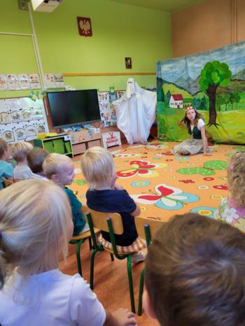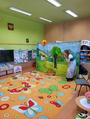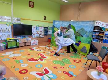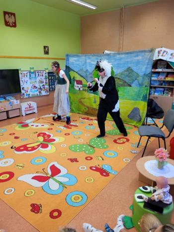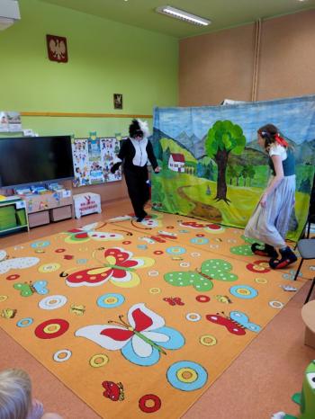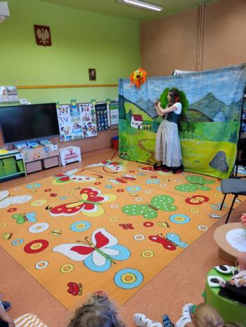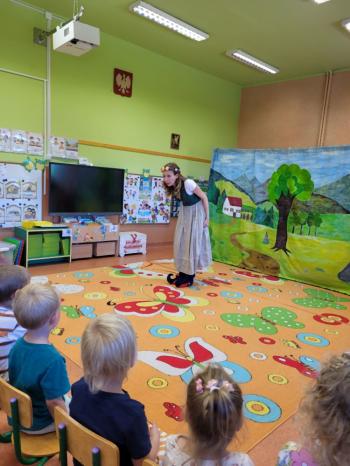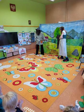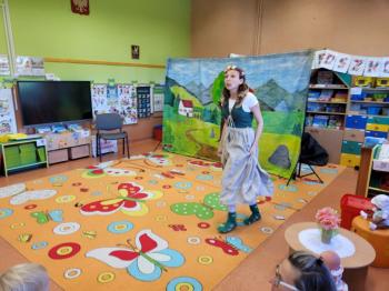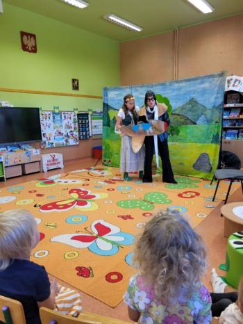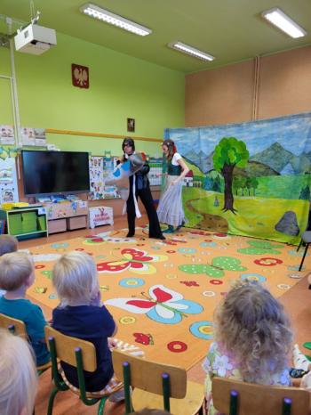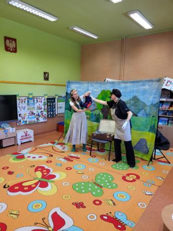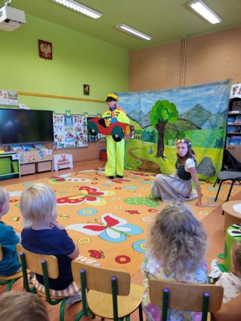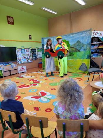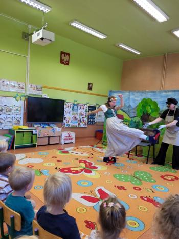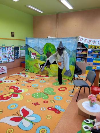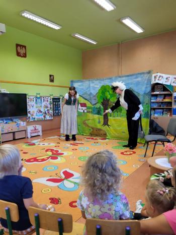 20 września nasze przedszkole odwiedził Teatrzyk Skrzat z Krakowa z przedstawieniem pt.,, Jak Marysia mała słonko złapać chciała”. Przygody małej bohaterki, która w siedmiomilowych butach goniła słońce i na swojej drodze spotykała różnych bohaterów przypadły do gustu przedszkolakom. Dzieci z zaciekawieniem śledziły kolejne wydarzenia, podziwiały wspaniałą grę aktorską, kostiumy i scenografię. Przedstawienie zawierało bardzo dużo elementów humorystycznych jak i treści edukacyjnych. Na koniec przedstawienia nasi wychowankowie nagrodzili aktorów gromkimi oklaskami. To był wspaniała niespodzianka na Dzień Przedszkolaka!!