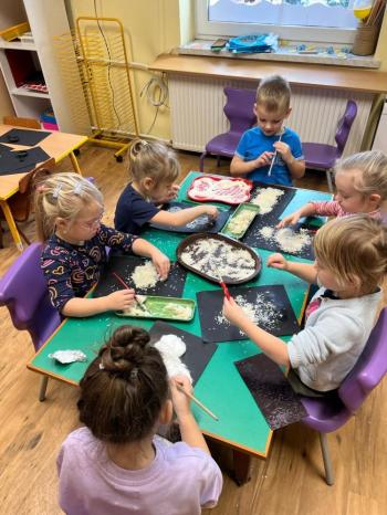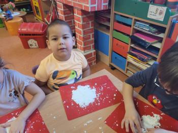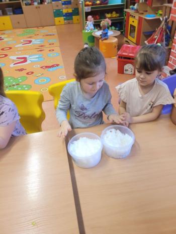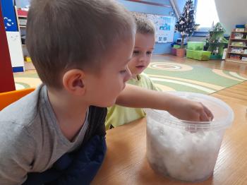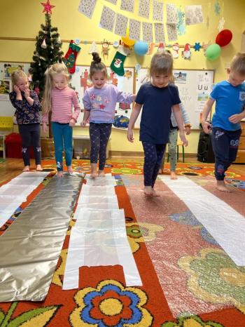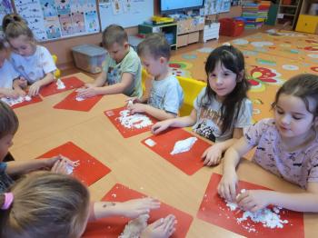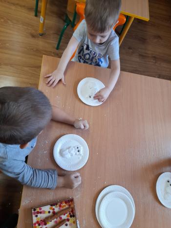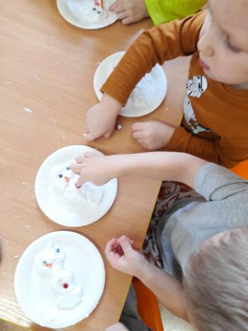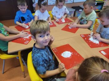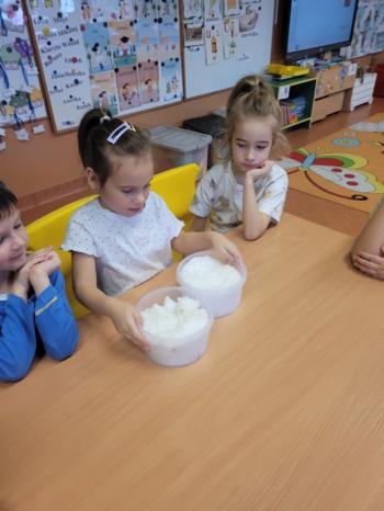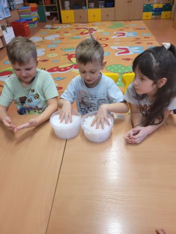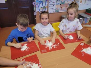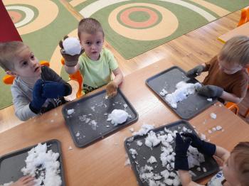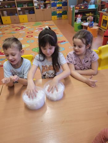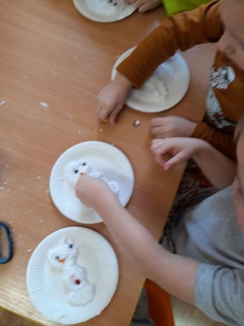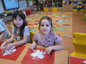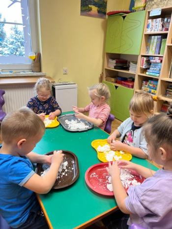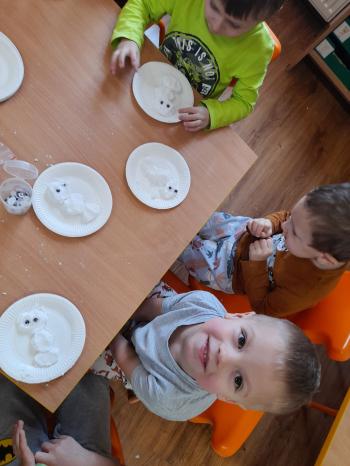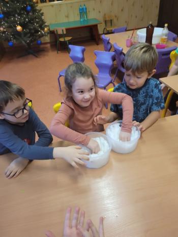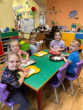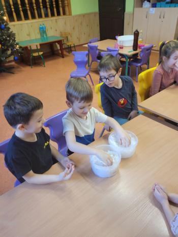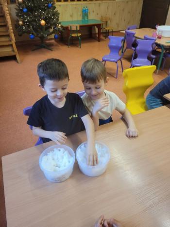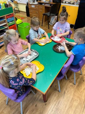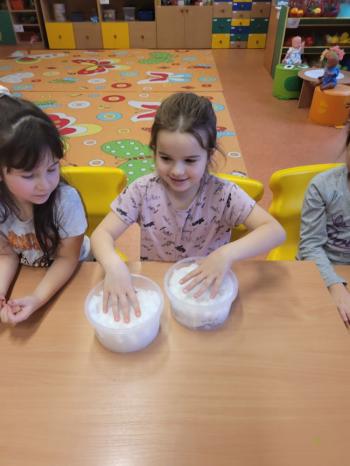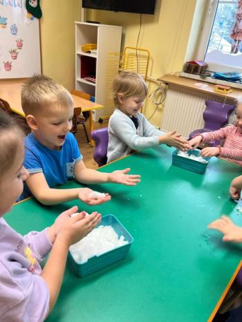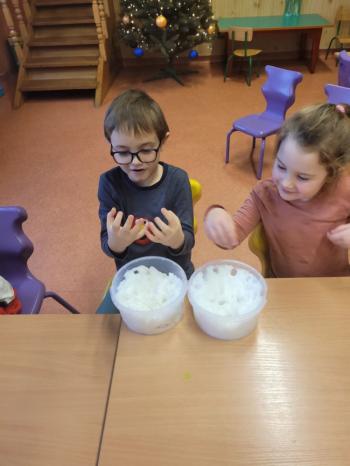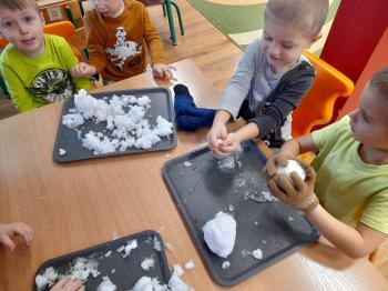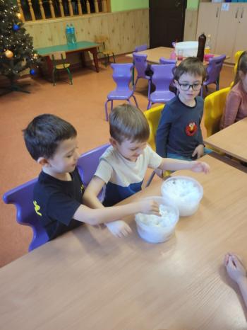 W dniu 12 stycznia odbył się dzień Aktywności pt.,, Dzień Śniegu”. Słoneczka ten dzień rozpoczęły od rozmowy o sportach zimowych, gdzie naśladowały sposób poruszania się sportowców uprawiających daną dyscyplinę zimową. Następnie uczestniczyły w zabawach: Wesołe kule, zabawy ze śnieżkami. Potem tworzyły za pomocą sody i pianki do golenia sztuczny śnieg, z którego ulepiły bałwanki. Na koniec eksperymentowały z prawdziwym śniegiem, określały jego właściwości, czy jest brudny czy czysty oraz kiedy się topi się a także lepiły bałwanki z prawdziwego śniegu. Natomiast u Kaczuszek ten dzień rozpoczął się powitaniem „Zimowe słoneczko uśmiech do Was ślę, jeśli chcesz się ze mną bawić to uśmiechnij się. Potem przedszkolaki uczestniczyły w zimowym spacerze sensorycznym a mianowicie boso spacerowały po wacie, ligninie, folii bąbelkowej oraz po folii aluminiowej. Brały udział w zabawach badawczych ze sztucznym i naturalnym śniegiem, oglądały przez lupy gwiazdki śniegowe. Na koniec wykonały pracę plastyczną „Nocne bałwanki” z wykorzystaniem wiórek kokosowych, ryżu i waty. Natomiast Żabki powitały się różnymi częściami ciała a później rozmawiały w formie burzy mózgów Po co jest potrzebny śnieg? Następnie przechodziły na boso po ścieżce sensorycznej z przyborami gimnastycznymi. Później bawiły się w eksperymentowanie z wodą, olejem, jajkiem oraz prawdziwym śniegiem. Na zakończenie lepiły śnieżne budowle ze sztucznego śniegu, który wykonały z mąki i oleju. To był niesamowity dzień dla wszystkich przedszkolaków!!! |