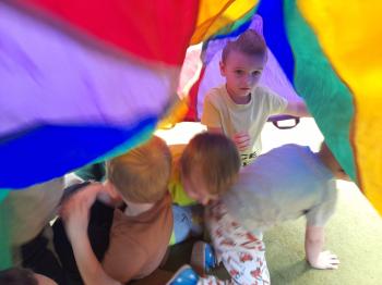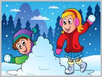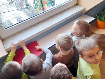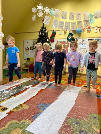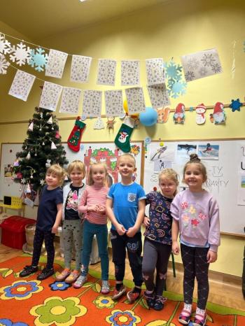 Idą dzieci ścieżynkami. Śnieżek chrupie pod nogami. Tam bałwanek mały stoi. Wiatru wcale się nie boi. Bielusieńki ma kożuszek i ze śniegu cały brzuszek. Hej Bałwanku chodźże z nami do przedszkola z życzeniami…