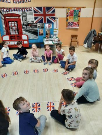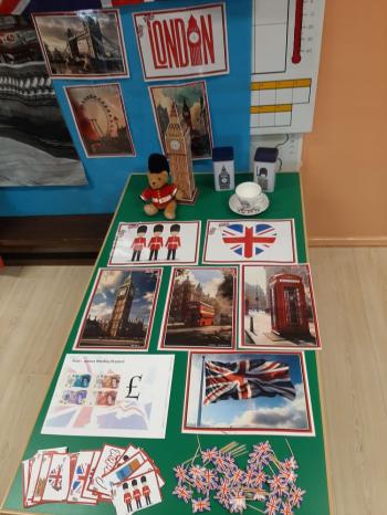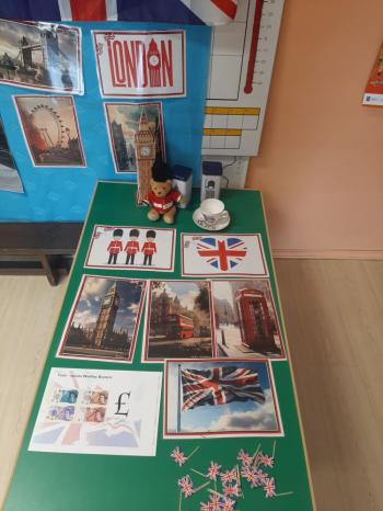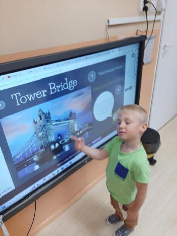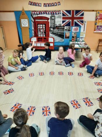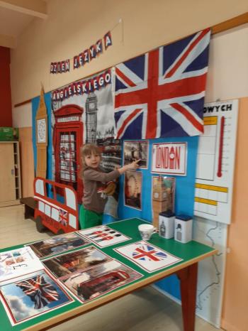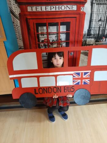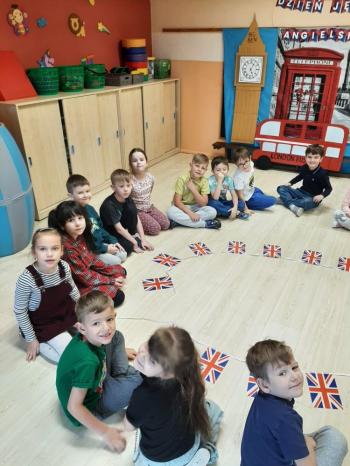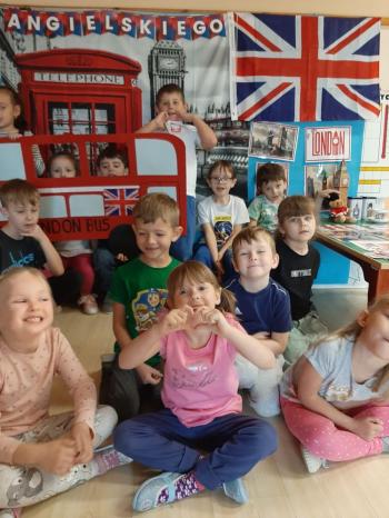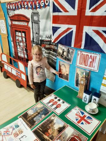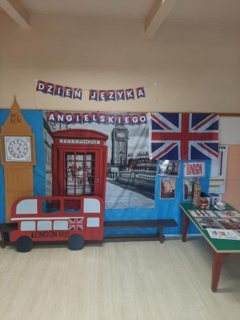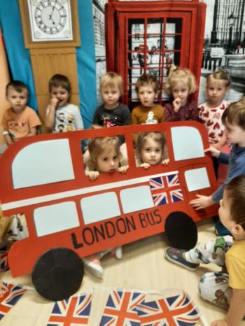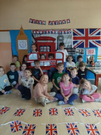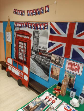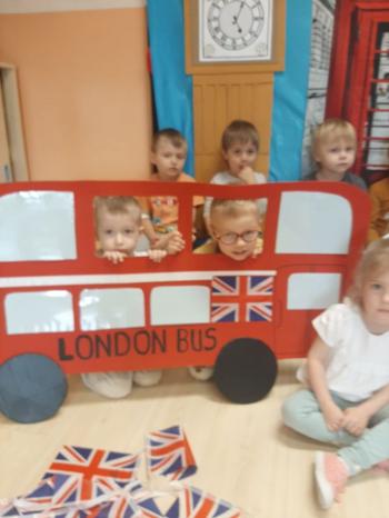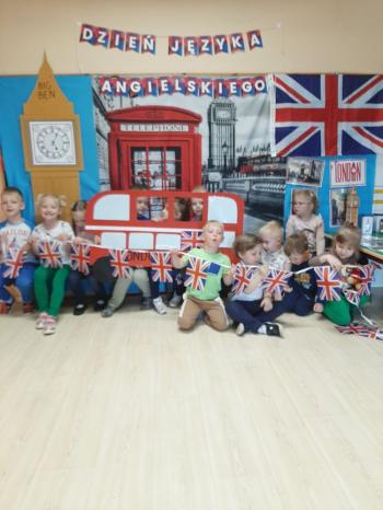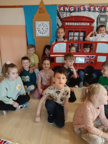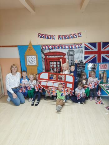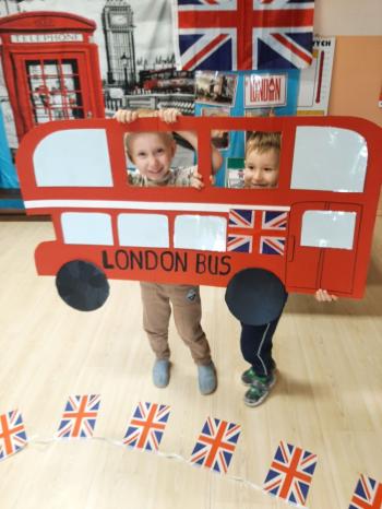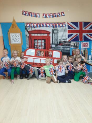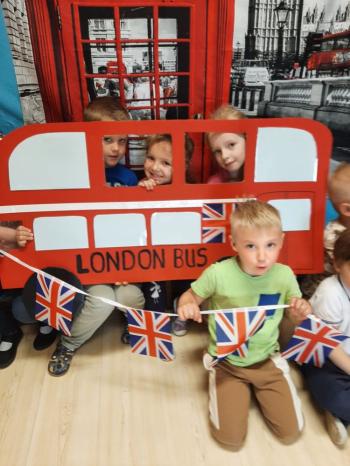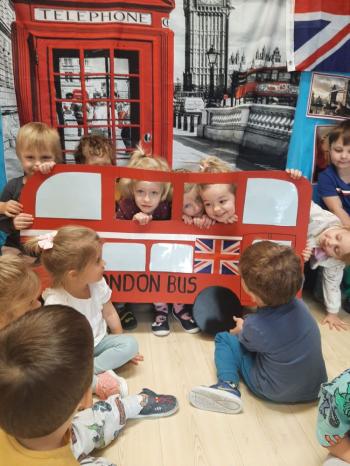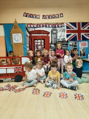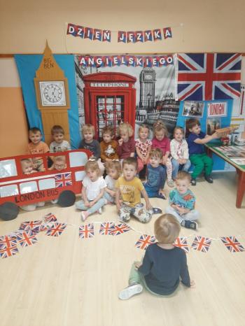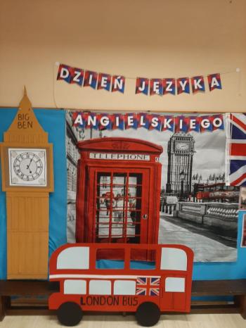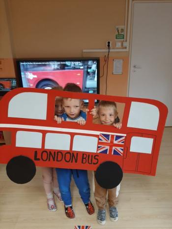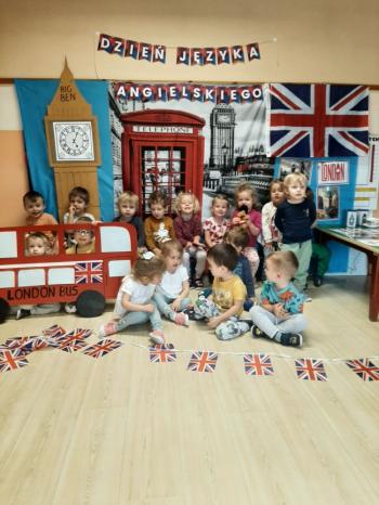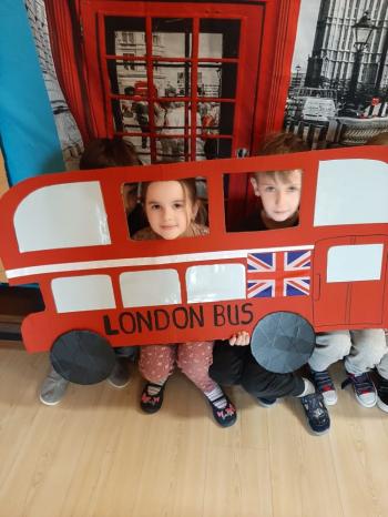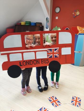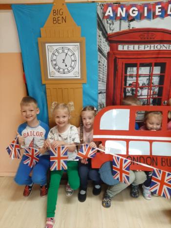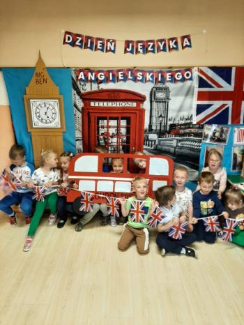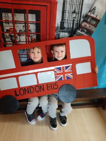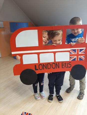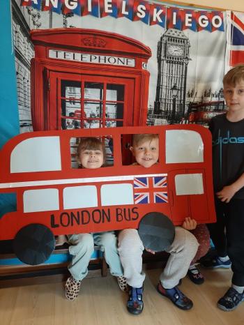 W dniu 23.04.2024 r. odbyły się warsztaty z Języka Angielskiego pod hasłem: ,,Światowy Dzień Języka Angielskiego”. Z okazji  tego dnia przedszkolaki oglądały prezentacje multimedialną o Wielkiej Brytanii, o jej symbolach, najważniejszych zabytkach i ciekawostkach. Dowiedziały się między innymi skąd pochodzi Język Angielski, co to jest Big Ben i London Eye, kim była królowa Elżbieta II i poznały obecnie panującego króla Karola III, ponadto podziwiały most Londyński oraz pałac Buckingam.Dla dzieci przygotowana została specjalna dekoracja, na której znalazły się zdjęcia z Londynu, flaga Wielkiej Brytanii, duża kartonowa wieża zegarowa oraz małe makiety mostu Londyńskiego i Bie Bena wykonane z puzli 3d. Największą atrakcją okazał się duży tekturowy autobus, który posłużył jako fotobudka oraz został wykorzystany jako pomoc dydaktyczna w podróży po Londynie do piosenki ,,The weels on the bus’’.  Na koniec zajęć przedszkolaki zostały nagrodzone za  aktywność małymi flagami Wielkiej Brytanii, które mogły zabrać do domu na pamiątkę. To był dzień naprawdę wielu wrażeń!!!