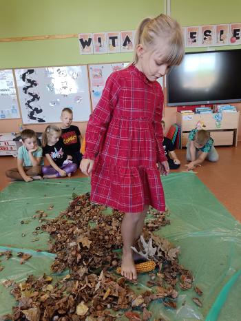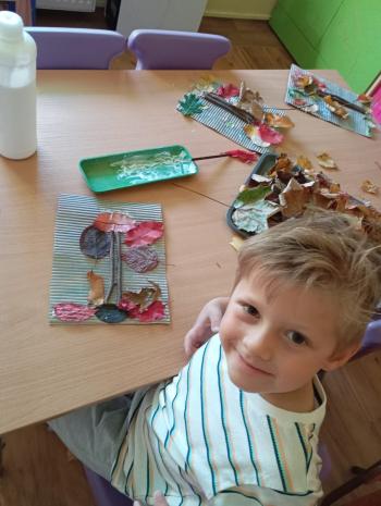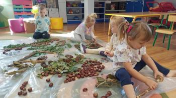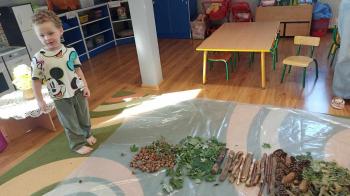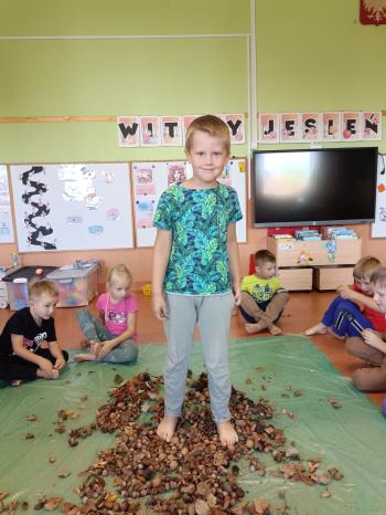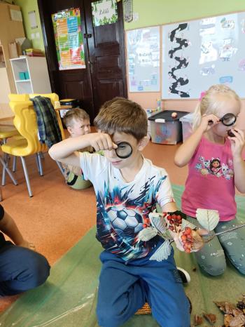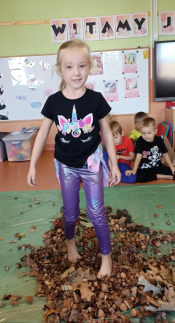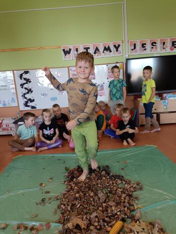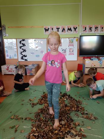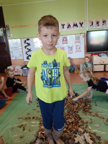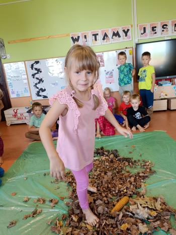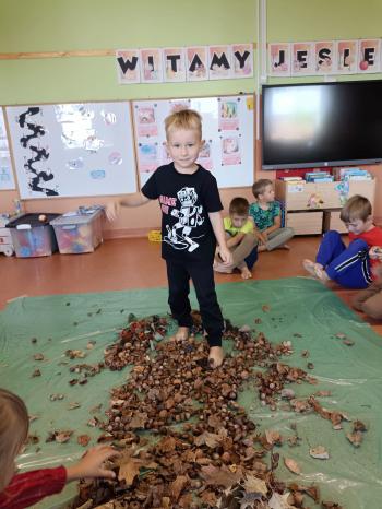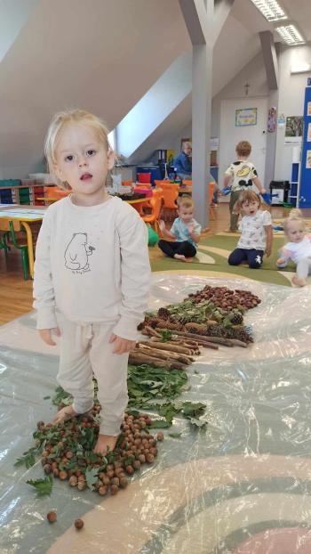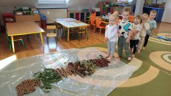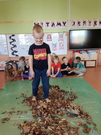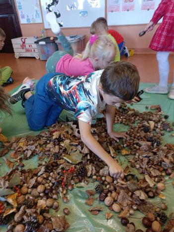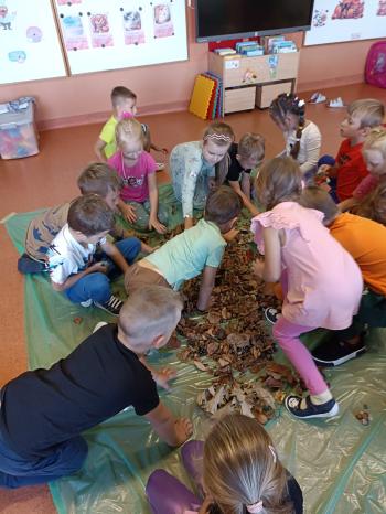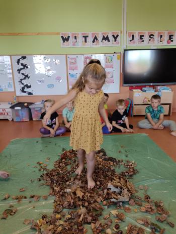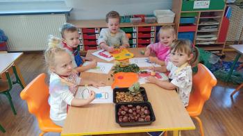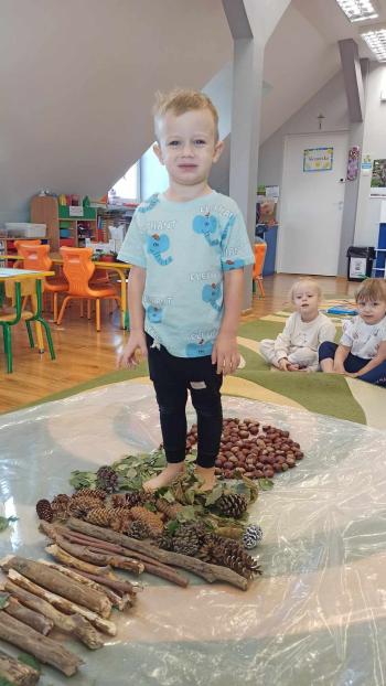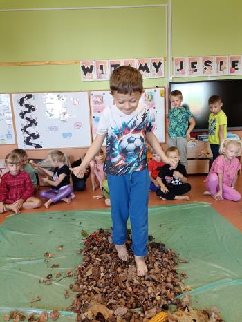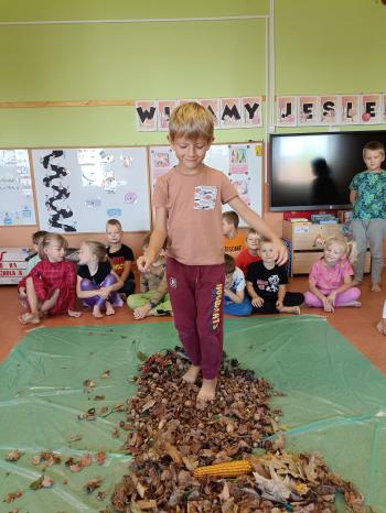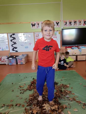 Nasze przedszkolaki 23 września witały nową porę roku. We wszystkich grupach dzieci poszerzyły swoją wiedzę przyrodniczą na temat zmian zachodzących jesienią. Najmłodsze ,,Słoneczka” segregowały dary jesieni oraz stworzyły piękne prace plastyczne z wykorzystaniem naturalnych materiałów (darów jesieni). Uczestniczyły we wspólnych zabawach integrujących grupę oraz tańczyły przy utworach związanych z tematyką jesienną. Przygotowany tor sensoryczny pozwolił maluszkom poznać i rozróżniać różne tekstury: miękką, twardą, szorstką i gładką. Dzięki wrażeniom zmysłowym, dzieci rozwijają umiejętności takie jak: zainteresowanie środowiskiem oraz kreatywność. „Kaczuszki” rozwijały swoją pomysłowość i sprawność manualną. Wykonywały prace plastyczne z użyciem naturalnych materiałów (liście), które same zebrały i przyniosły do przedszkola. Powstały piękne prace z jesiennymi drzewami. Kolorowymi liśćmi ozdabiały sukienkę i włosy Pani Jesieni, wyklejały igiełkami jeże. Najstarsze „Żabki” rozpoczęły zajęcia swobodnymi wypowiedzi na temat darów jesieni. Następnie brały udział w rozwiązywaniu zagadek sensorycznych, uruchamiając zmysły: smaku, słuchu i dotyku oraz zadaniach klasyfikacyjnych, segregując dary jesieni wg wskazanej kategorii. Miłym akcentem był masaż relaksacyjny. Na zakończenie dzieci wykonały pracę plastyczną z użyciem niektórych materiałów. |