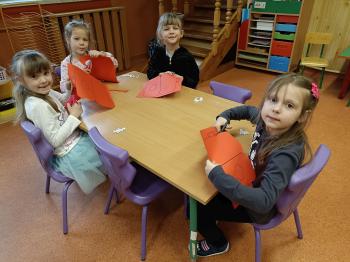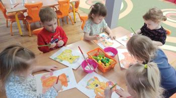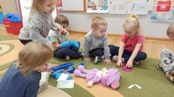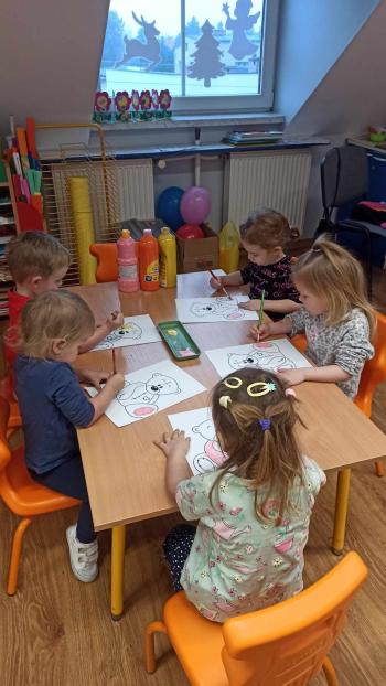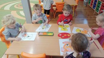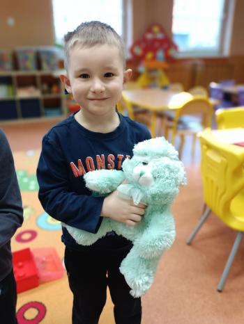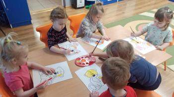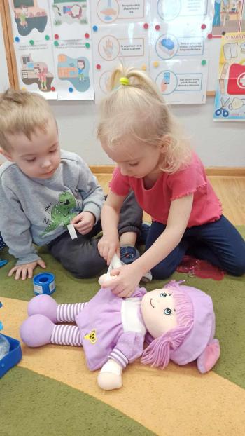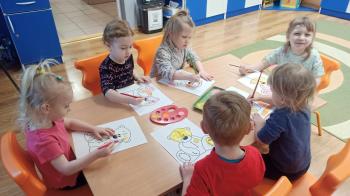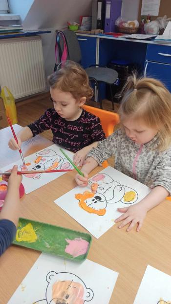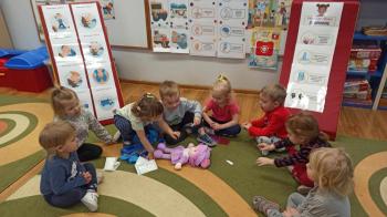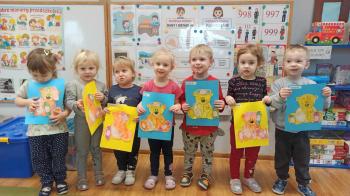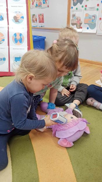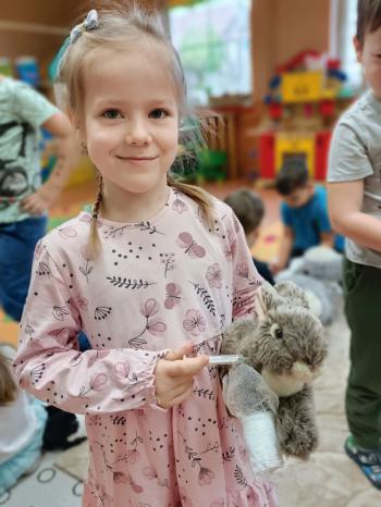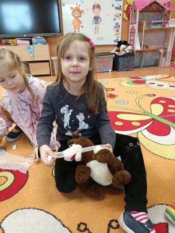Grupa „Słoneczek” Podczas zajęć plastycznych najmłodsze przedszkolaki przeniosły się do pasjonującego świata medycyny, gdzie ich głównymi bohaterami był chory miś i lalka. „Słoneczka” z zapałem wykonywały prace plastyczne, nadając im kolorowe i radosne oblicze. Każde dziecko miało okazję wykazać się kreatywnością, co sprawiło, że mały pacjent ,,Miś” wyglądał naprawdę wyjątkowo! Dzieci wcieliły się również w rolę małych lekarzy, bawiąc się w diagnostykę. Poprzez zabawę utrwalały podstawowe umiejętności udzielania pierwszej pomocy. Zajęcia były pełne śmiechu i radości, ich celem było wzmocnienie postawy odpowiedzialności i gotowości do udzielenia pomocy potrzebującym. To była nie tylko artystyczna przygoda, ale także ekscytująca nauka. Grupa „Kaczuszek” „Kaczuszki” tego dnia brały udział w zabawach matematycznych rozwijających kompetencje poznawcze takich jak: -"Zagadki" - nauczyciel zadawał dzieciom zagadki związane z pracą lekarza, dzieci odgadywały, odszukiwały obrazek, wieszały go na tablicy. -"Miś uczy się liczyć" - nauczyciel podaje nazwę jednego z różnych przedmiotów związanych z pracą lekarza, dzieci próbowały wskazać je na planszy, przeliczyć, dopasować odpowiednią ilość oczek oraz cyfrę. -"Miś ma ospę" - Dzieci rzucały kostką, liczyły wyrzucone oczka na kostce, pokazywały na palcach ile kropek wyrzuciły, zadaniem dzieci było przykleić taką samą ilość czerwonych pomponów do chorego Misia. -"Pomóż Misiowi zwalczyć anemię" - Dzieci wraz z nauczycielem rozmawiały w kole o tym co oznacza dla nich zdrowie, jak o nie dbają. Przedszkolaki opowiadały o tym co lubią jeść, jak dbają o ząbki lub bawią się na powietrzu. Zastanawiały się nad tym jak można zadbać o zdrowie Misia aby zaczął się czuć dobrze każdego dnia. Dzieci wykonały przetaczanie krwinek czerwonych w celu zwalczenia anemii u Misia. Zachęciły go również do jedzenia większej ilości roślin strączkowych, szpinaku i rukoli w celu uzupełnienia niedoboru żelaza. -"Z wizytą u lekarza" - przedszkolaki przyjęły kolejnego pacjenta który uległ wypadkowi w czasie jazdy na rowerze. Wykonały zdjęcie rtg łapki. Zszyły ranę skóry. Opatrzyły rękę. Każdy z pacjentów został przebadany i pozostawiony w szpitalu na obserwacji. Na zakończenie zajęć dzieci wykonały eksperyment z wodą i chusteczką. W małym szpitalnym laboratorium dzieci obserwowały jak zachowa się chusteczka higieniczna zanurzona w kubeczku z wodą na której wcześniej przedszkolaki namalowały dwa kolorowe koła. Chusteczkami o różnych wzorach i barwach ozdobiły kolorowankę.