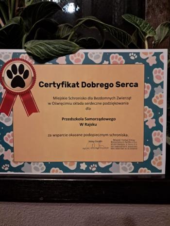 PODZIĘKOWANIE Serdecznie dziękujemy Rodzicom i Dzieciom za włączenie się w akcję „POMAGAMY ZWIERZĘTOM- Miejskie Schronisko dla Bezdomnych Zwierząt w Oświęcimiu”, która trwała ona od 13 - 31 stycznia i miała na celu zbiórkę karmy, artykułów gospodarczych, środków czystości dla psów i kotów ze schroniska. Zebrane rzeczy ze zbiórki zostały przekazane pracownikom Miejskiego Schroniska dla Bezdomnych Zwierząt 4 lutego. Nasza placówka zdobyła certyfikat „Dobrego Serca” za okazaną pomoc. Dziękujemy za współpracę. |