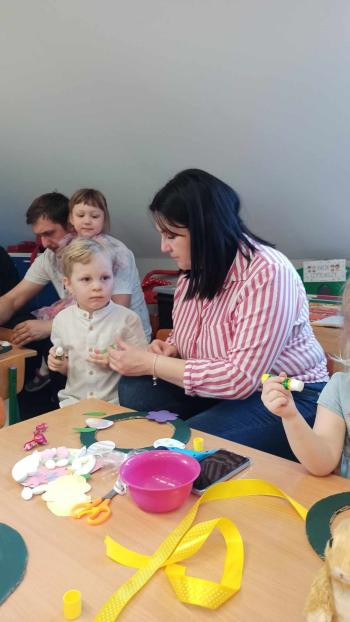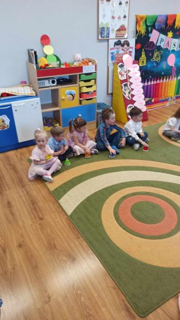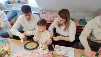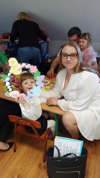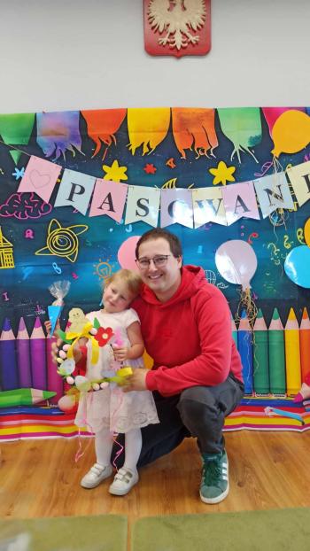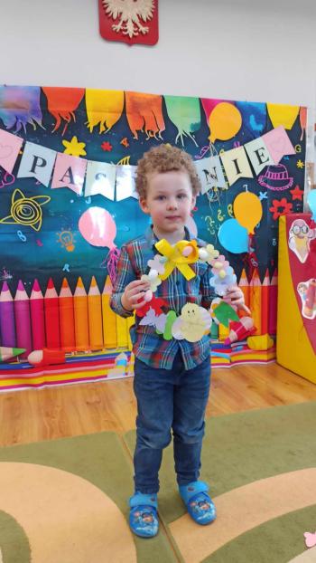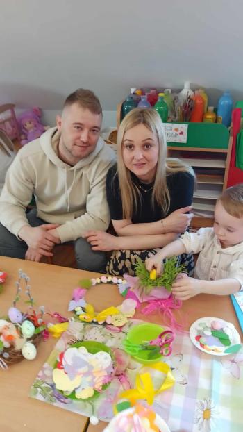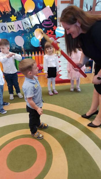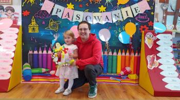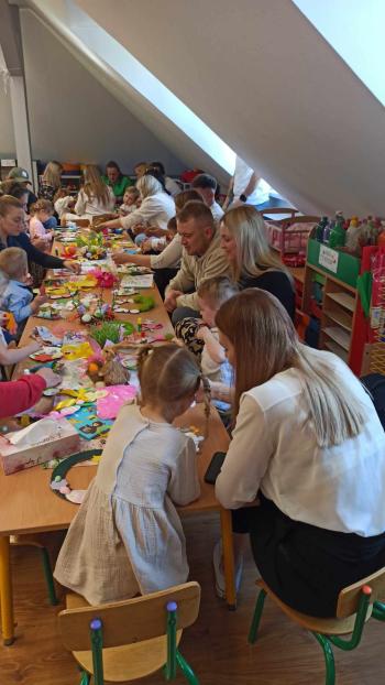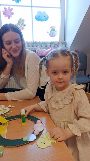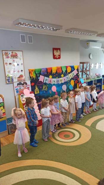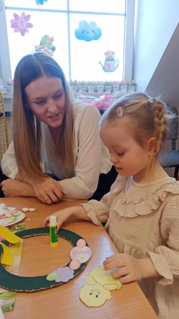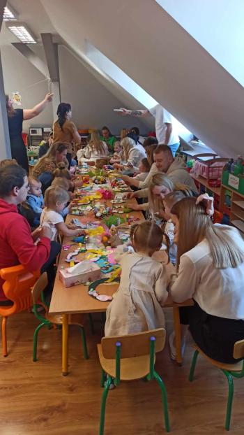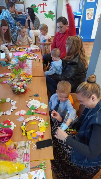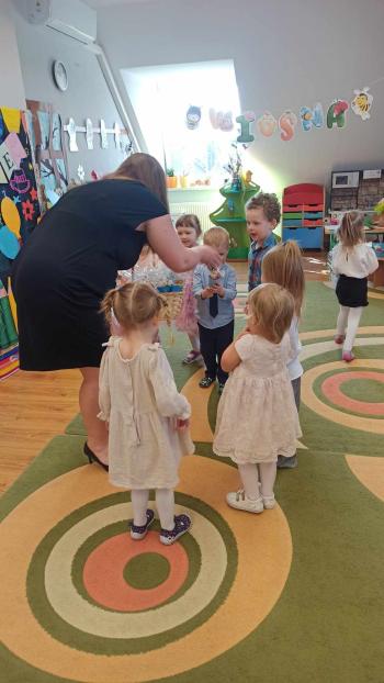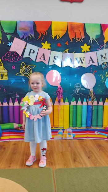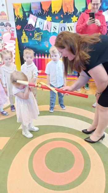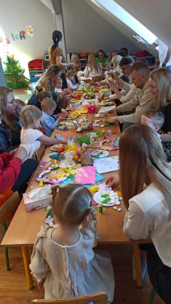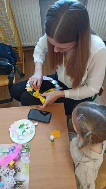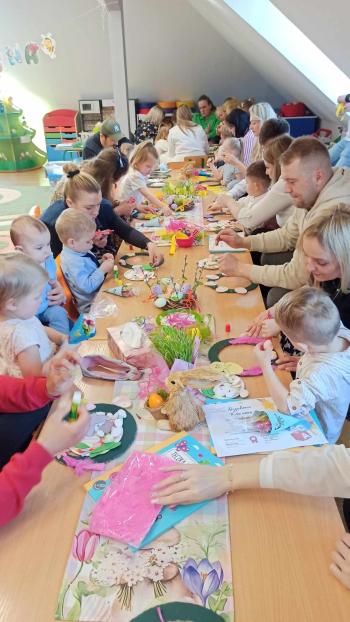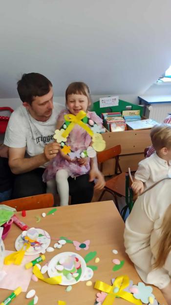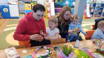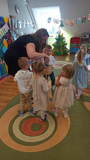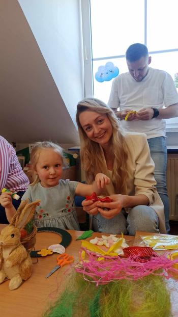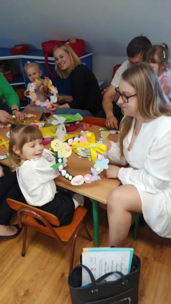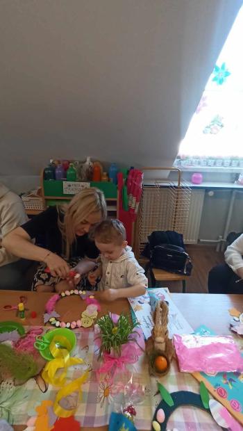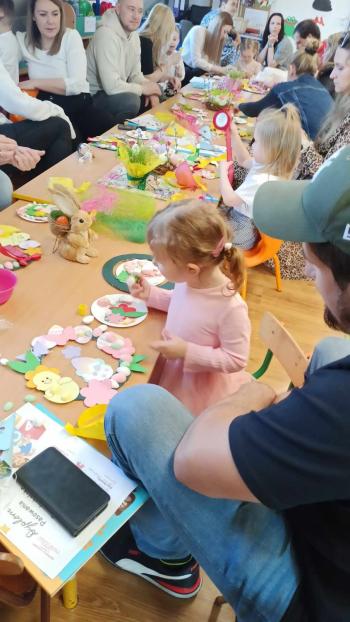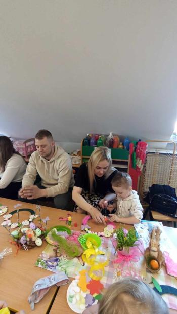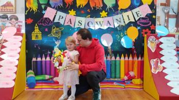 „Słoneczka” – 14 IV - W najmłodszej grupie warsztaty wielkanocne były połączone z uroczystym „Pasowaniem na przedszkolaka”. Maluchy zaprezentowały krótki program artystyczny: wierszyki, piosenki i zabawy taneczne. Złożyły uroczystą przysięgę, po której „specjalnym ołówkiem” pani dyrektor pasowała ich na przedszkolaków. „Słoneczka” otrzymały dyplomy, upominki oraz słodkie rożki od swoich starszych kolegów z grupy „Kaczuszek” i „Żabek”. Po uroczystości wspólnie z rodzicami stworzyły niepowtarzalne dekoracje świąteczne – ścienne ozdoby wielkanocne, które pozwoliły im rozwijać kreatywność, ale także sprzyjały budowaniu relacji, integracji i wspólnej zabawy w przyjaznym otoczeniu. |
