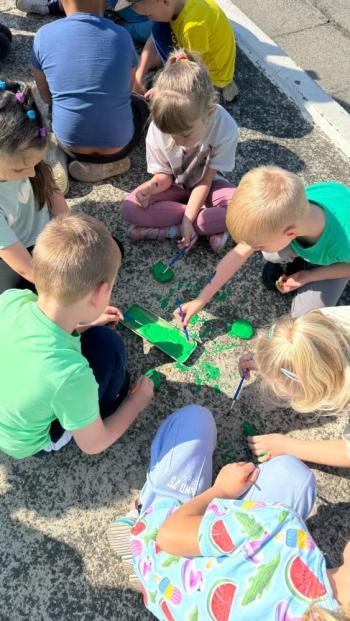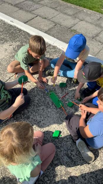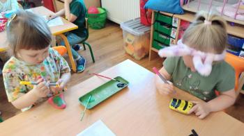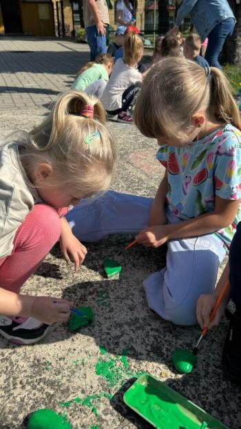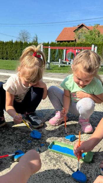 Maluchy oglądały plansze edukacyjne „Ziemia - naszym domem”. Poznały zasady ochrony środowiska naturalnego i działania takie jak: segregacja śmieci, oszczędzanie wody i energii elektrycznej. Następnie wykonywały prace plastyczne z wykorzystaniem kamieni. Malowały farbami otoczaki. Tak powstały „kamienne zwierzęta”. Starsze przedszkolaki obejrzały film edukacyjny na temat naszej planety - Ziemi. Dowiedziały się co jej grozi, jeśli nie zaczniemy o nią dbać, a także co robić, aby ją chronić. Stworzyły wspólnie z kamieni kulę ziemską, którą utworzyły na przedszkolnym podwórku. |