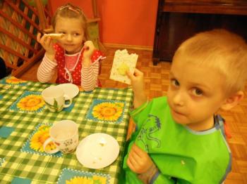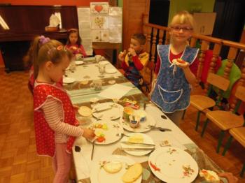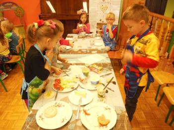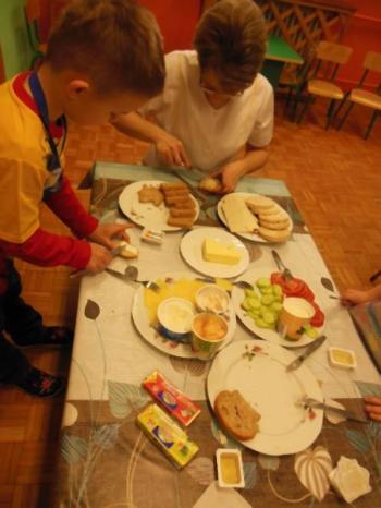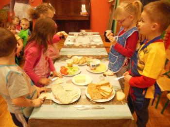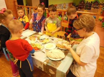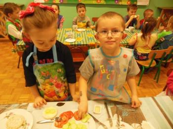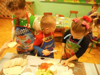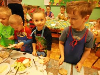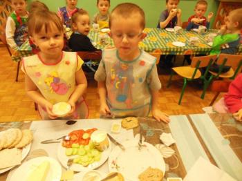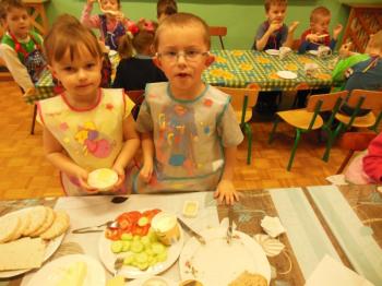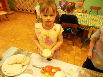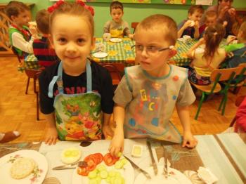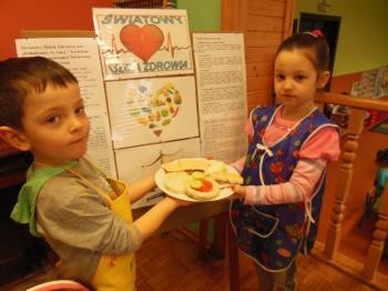 Przedszkolaki w tym dniu poznały „Pięć kroków do bezpiecznej żywności” oraz znaczenie czystości, higieny i sposobu odżywiania, określały także, które produkty są zdrowe a których powinniśmy unikać. Zorganizowaliśmy w tym dniu „Dzień Drugiego Śniadania” w ramach którego sami przygotowywaliśmy zdrowe kanapki, a następnie wykonaliśmy pracę plastyczne na temat „Zdrowy talerzyk”.