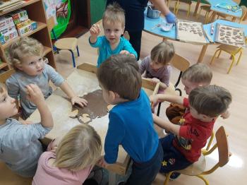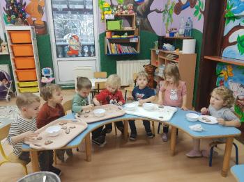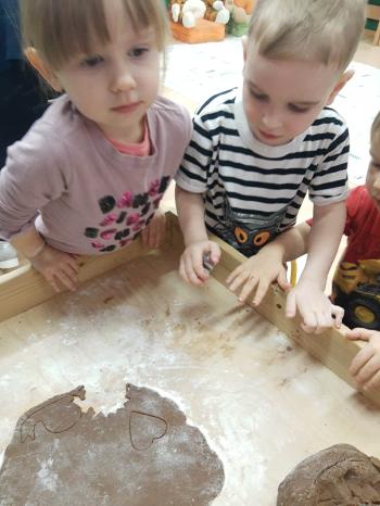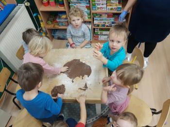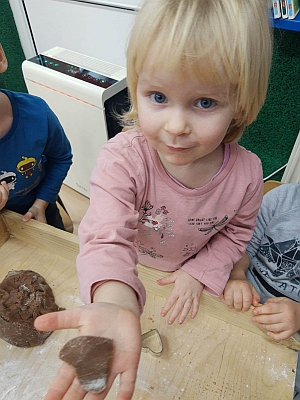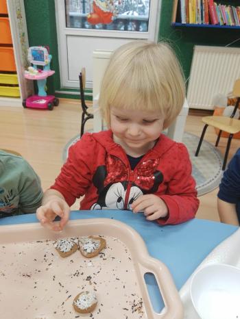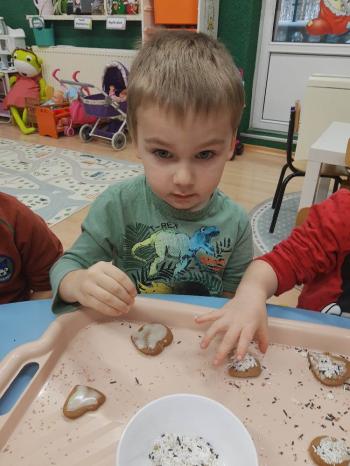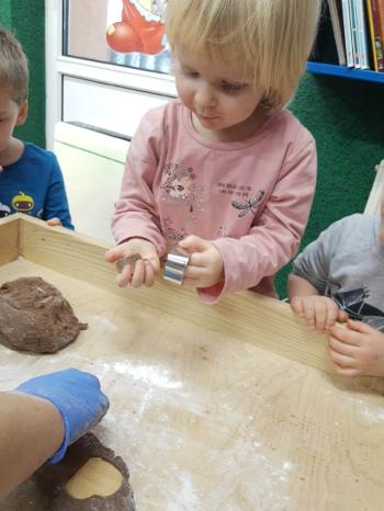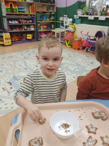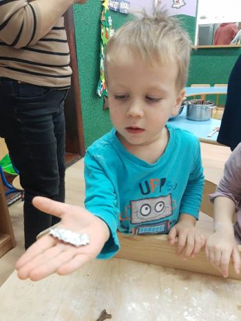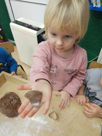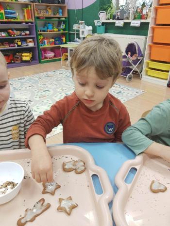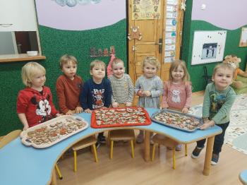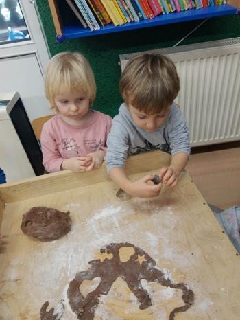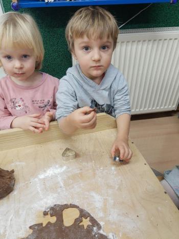 Przedszkolaki zgodnie z przedświąteczną tradycją piekły świąteczne pierniczki. Z pomocą pań praca z przygotowaniem wypieków szła sprawnie i bez trudu. Dzieci wałkowały ciasto i wykrawały pierniki różnych kształtów przy pomocy foremek. Po włożeniu wyciętych ciastek do piekarnika w całym przedszkolu zaczął unosić się słodki zapach korzennych pierników. Wspólne pieczenie i dekorowanie pierników było doskonałą zabawą. Pięknie przyozdobione pierniki będą wspaniałą dekoracją świątecznego stołu.