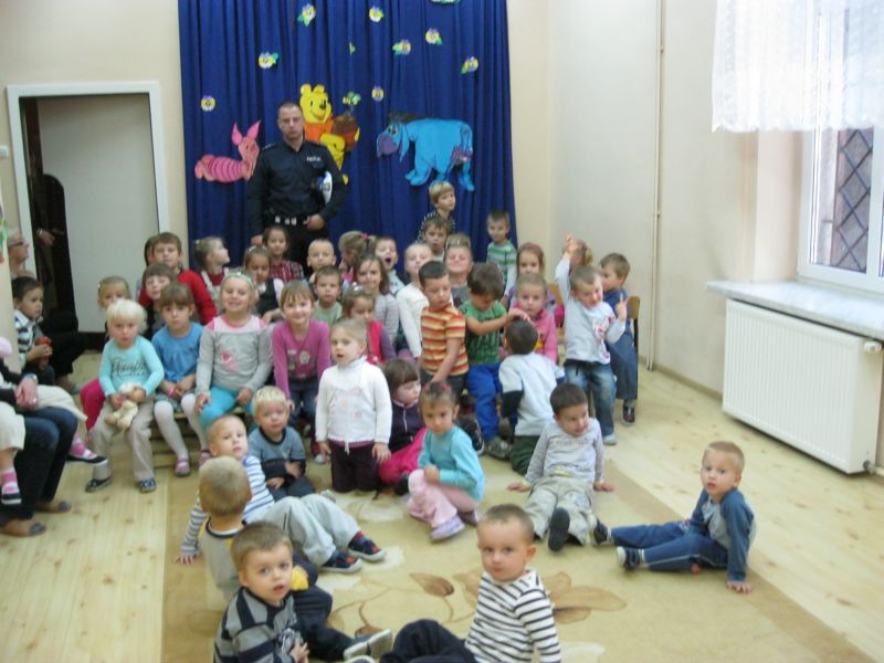 wszystkie dzieci były zachwycone i słuchały z zainteresowaniem. Pan Policant przekazał najwazniejsze informację o których warto pamietać już w przedszolu. Była także okazja pooglądać narzedzia pracy Pana Policjanta pełniacego służbę w Ruchu Drogowym oraz przymierzyć policyjna czapkę