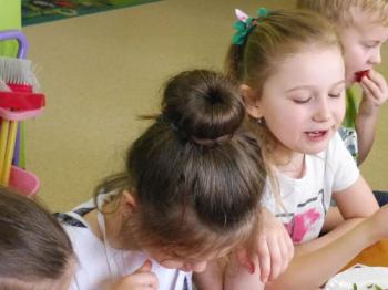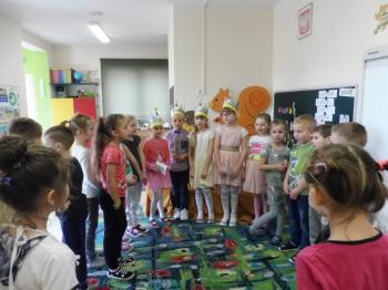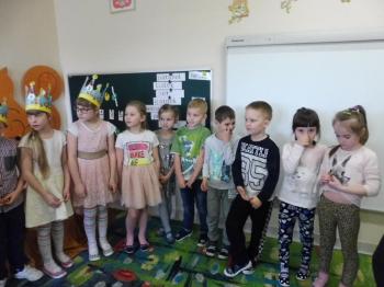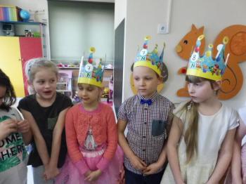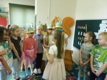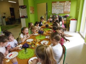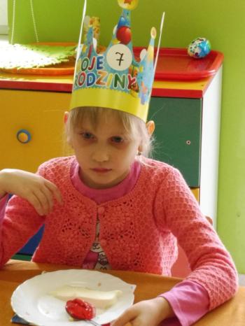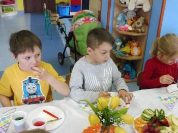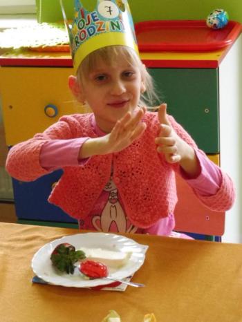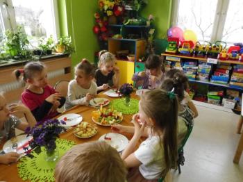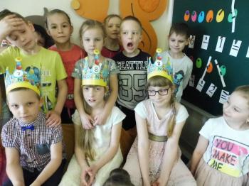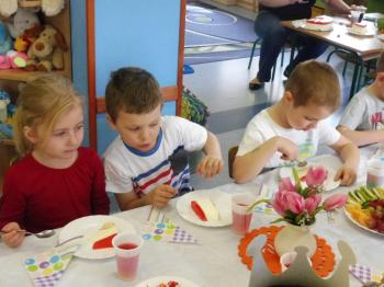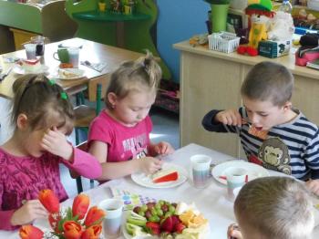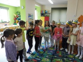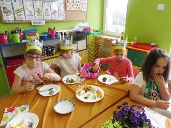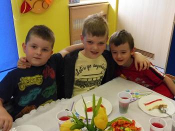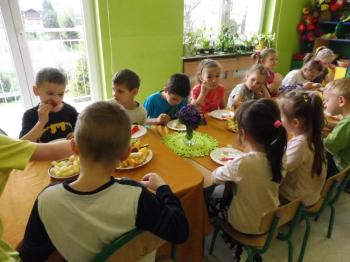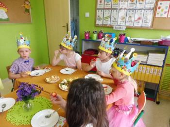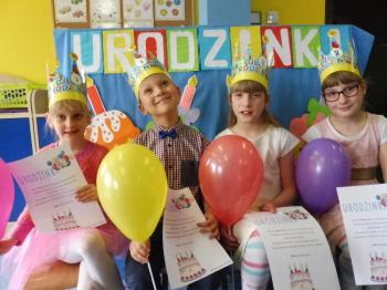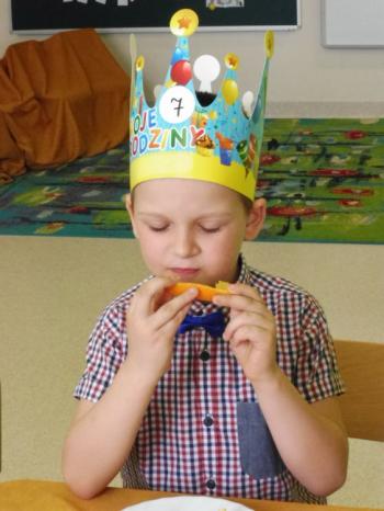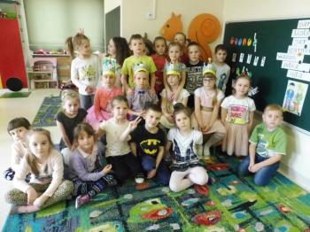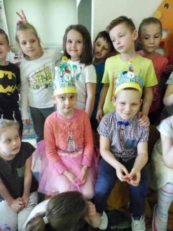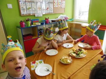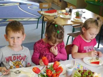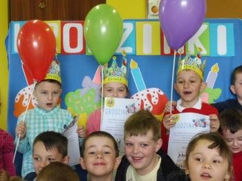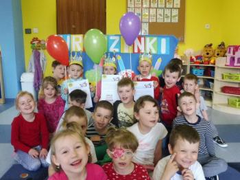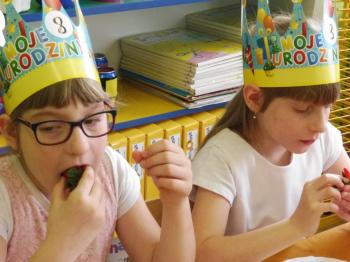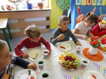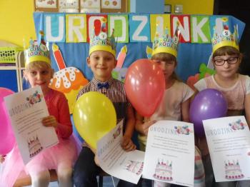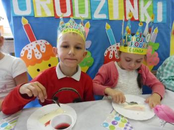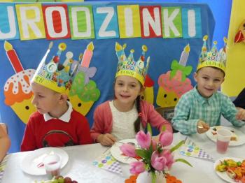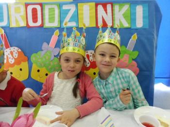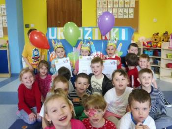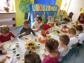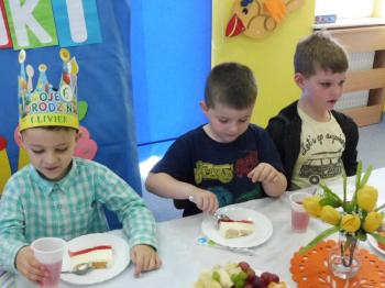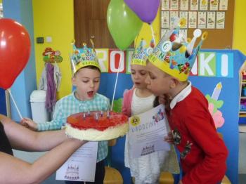 Koledzy i koleżanki składali solenizantom najlepsze życzenia, były dyplomy, balony, naklejki i piękne torty. Po zdmuchnięciu świeczek na tortach, wszyscy delektowali się ciastem upieczonym przez panie kucharki oraz tęczowymi galaretkami wykonanymi przez jedną z mam. Oprócz słodkości były też witaminki w postaci owoców.