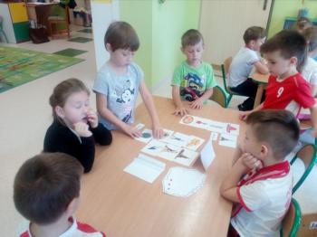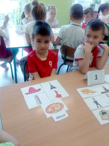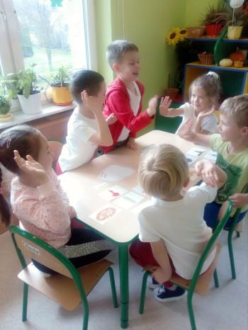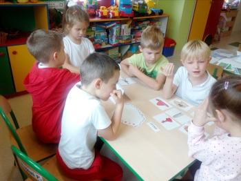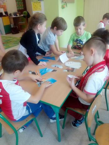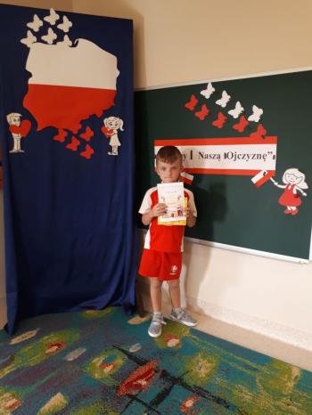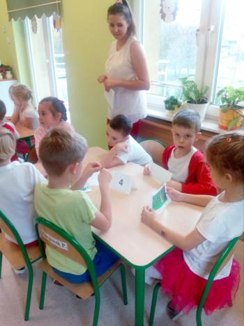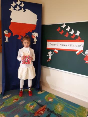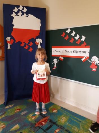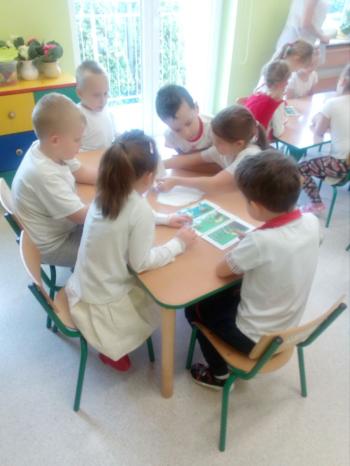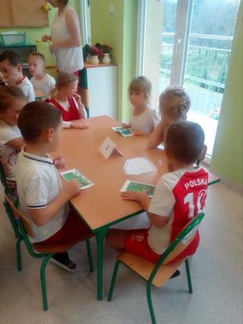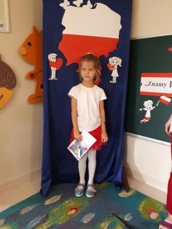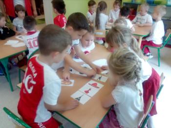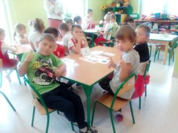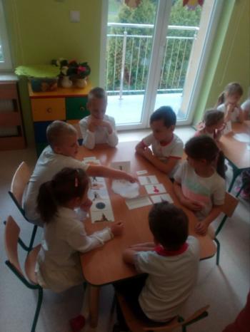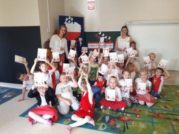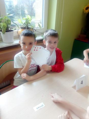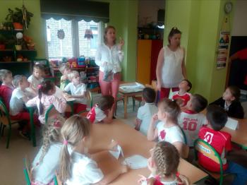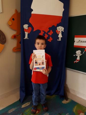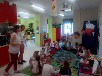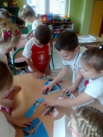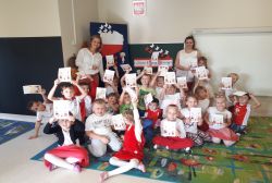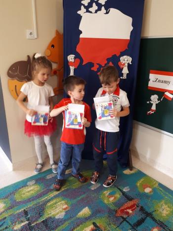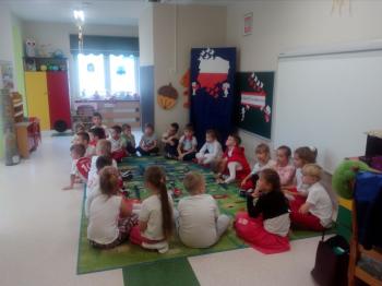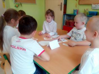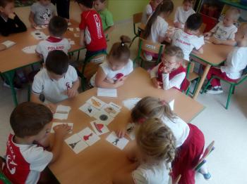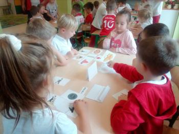 W tym dniu wszystkie starszaki oraz Panie ubrały się w barwy naszej flagi, czyli królowała biel oraz czerwień. Podczas spotkania dzieci zostały podzielone na 4 drużyny, z których każda musiała wykazać się w aż 7 konkurencjach. Pierwsza – zadaniem dzieci było dopasować trzy obrazki do legend czytanych przez nauczyciela. Druga – starszaki układały puzzle z aż czterema miejscowościami (Kraków, Warszawa, Wrocław, Gdańsk) do których po ułożeniu należało dopasować napisy z nazwami poszczególnego miasta. Trzecia – przedszkolaki oddzielały obrazki, te, które kojarzą im się z Polską (np. pierogi, oscypek) od tych, które bardziej przypisały by do miejsc na Świecie (np. pizza, czy sombrero). Konkurencja czwarta, to konkurencja ruchowa – jedna osoba z każdej drużyny, mogła wrzucić woreczek do obręczy, ale tylko wtedy, gdy wcześniej odpowiedziała poprawnie na pytanie zadane przez nauczyciela. W trakcie piątej konkurencji każda drużyna losowała po trzy pytania, na które należało wybrać odpowiedź z podpowiedzi a,b lub c. Szóste zadanie wiązało się zarówno ze znajomością polskich utworów jak również szybkością, gdyż „kto pierwszy, ten lepszy” J. Zadaniem dzieci było odgadnąć i nazwać takie melodie jak: hejnał, Hymn, muzyka do Krakowiaka, Poloneza oraz (co sprawiło największą trudność) kołysankę pt. „Ah śpij, kochanie” – zatem, rodzice, Wasza w tym rola, aby zacząć śpiewać kołysanki dzieciom do snu J. Na koniec, w trakcie siódmej konkurencji, starszaki układały obrazki przypominające morze, góry, Warszawską Syrenkę oraz Smoka Wawelskiego w odpowiednich miejscach na mapie Polski. Za każdą dobrze wykonaną konkurencję dzieci otrzymywały punkty w formie serduszek przyklejanych na konturach Polski. Pragniemy dodać, że wszystkie drużyny uzyskały niemalże maksymalną ilość punktów.