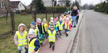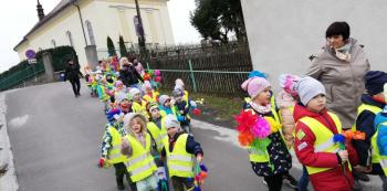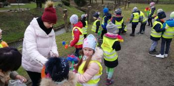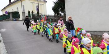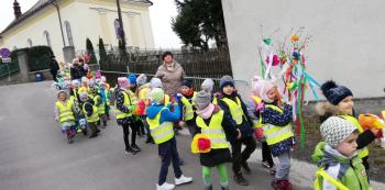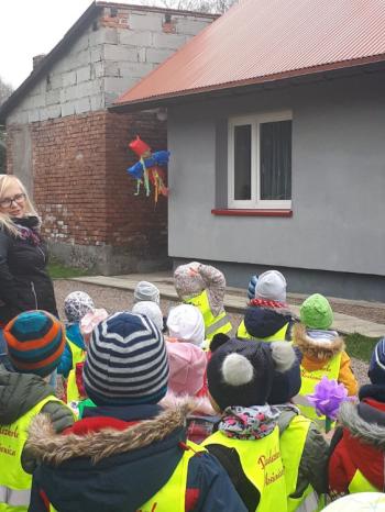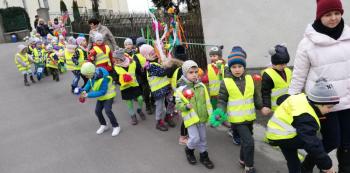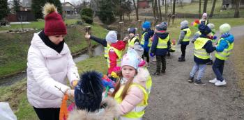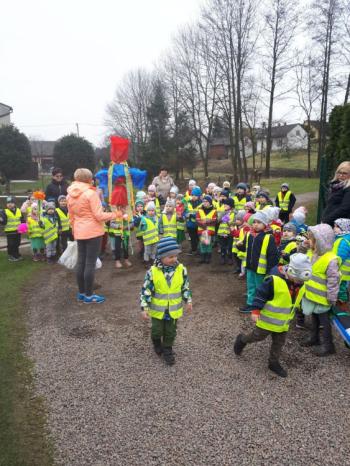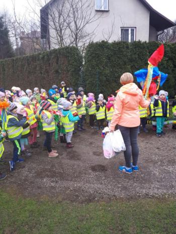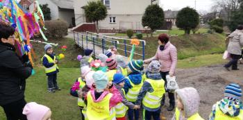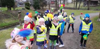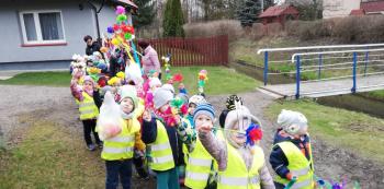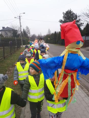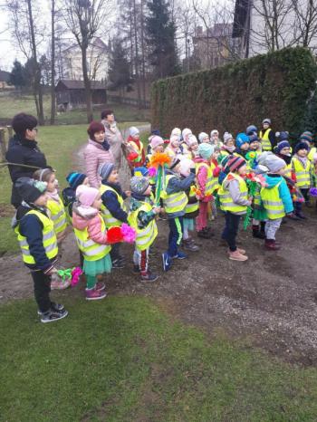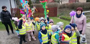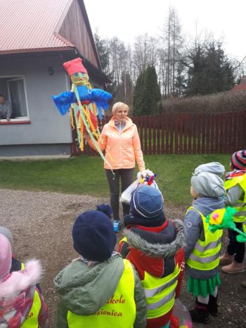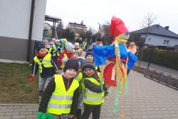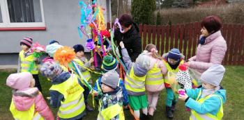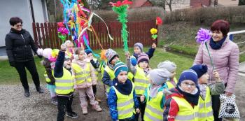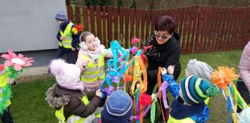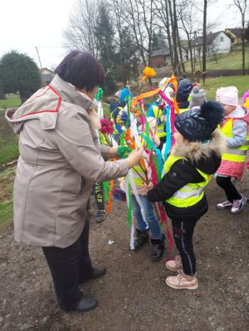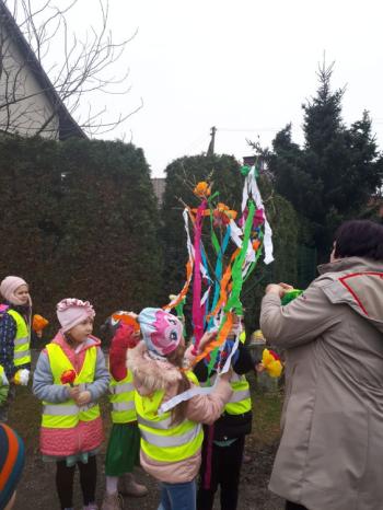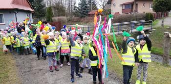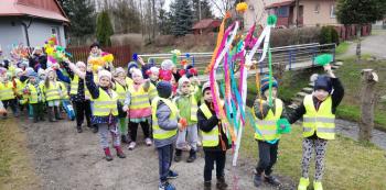 21 marca około godziny 10 - tej wyruszyliśmy z przedszkola marszowym korowodem z naszą MARZANNĄ i udaliśmy się nad pobliską rzekę. Kiedy dotarliśmy na miejsce, w którym każdego roku żegnamy zimę i witamy wiosnę, gromkimi okrzykami pożegnaliśmy MARZANNĘ, prosząc żeby zabrała ze sobą zimę, bo bardzo tęsknimy za słońcem, kwiatami i śpiewem ptaków. Marzanna z żalem i ze smutkiem na twarzy, schowała się za jednym z domów i jak każdego roku, wieczorem wskoczyła w otchłań wody zabierając śniegi i mrozy popłynęła do morza. Jesteśmy tego pewni, ponieważ drugiego dnia już jej tam nie zastaliśmy. Następnie dzieci dekorowały gaiki maiki kolorowymi kwiatami wykonanymi przez członków rodziny i ze śpiewem na ustach wracaliśmy do przedszkola, ogłaszając mieszkańcom Włosienicy, że oficjalnie powitaliśmy WIOSNĘ.