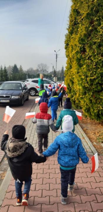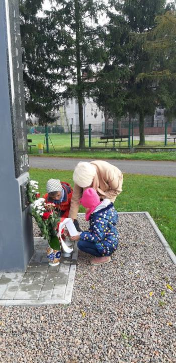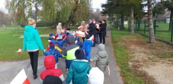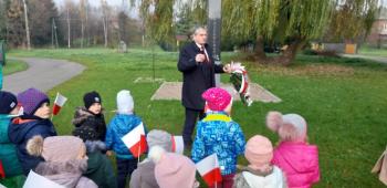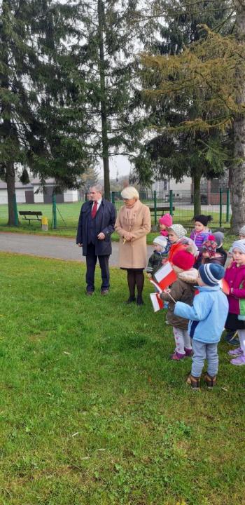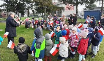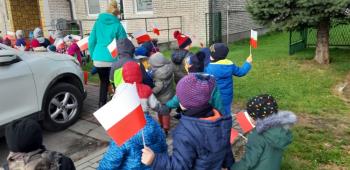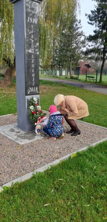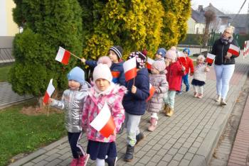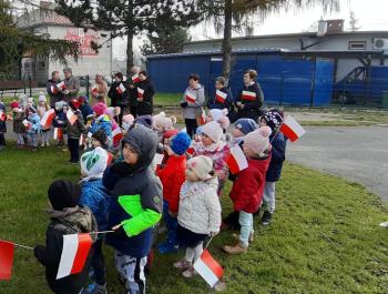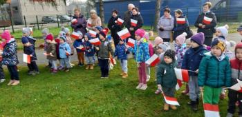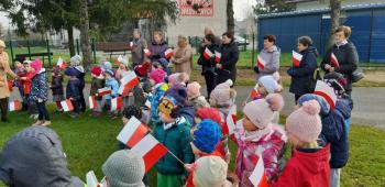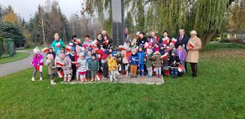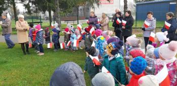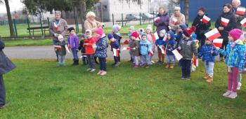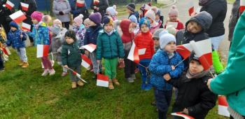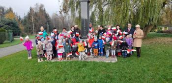 Dnia 8 listopada 2019r. wspólnie z dziećmi upamiętniliśmy w naszym przedszkolu kolejną rocznicę odzyskania niepodległości przez Polskę. Tego dnia gościliśmy w przedszkolu sołtysa Włosienicy Pana Władysława Zalińskiego, który przybliżył przedszkolakom charakter tego ważnego święta oraz zapoznał ich z krótką historią walki Polski o niepodległość. Po krótkiej prelekcji naszego gościa, wszyscy wspólnie z członkami Rady Sołeckiej udaliśmy się pod tutejszy pomnik upamiętniający odzyskanie przez Polskę niepodległości. W tym miejscu została złożona symboliczna wiązanka kwiatów oraz zapalono znicze, a punktualnie o godzinie 11:11 wszyscy odśpiewaliśmy ,,Mazurek Dąbrowskiego,” włączając się tym samym do akcji ,,Szkoła do Hymnu.”